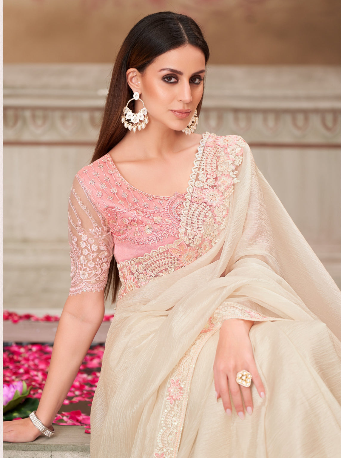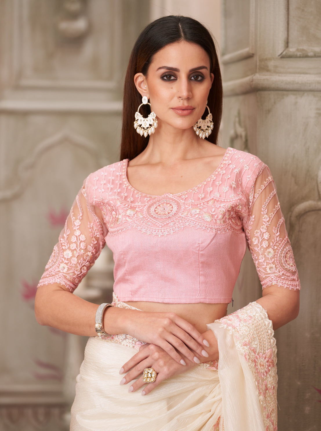 A refined Pearl White blouse crafted in lustrous satin silk with rich tussar silk accents. Elegant and breathable, perfect for festive and traditional occasions.