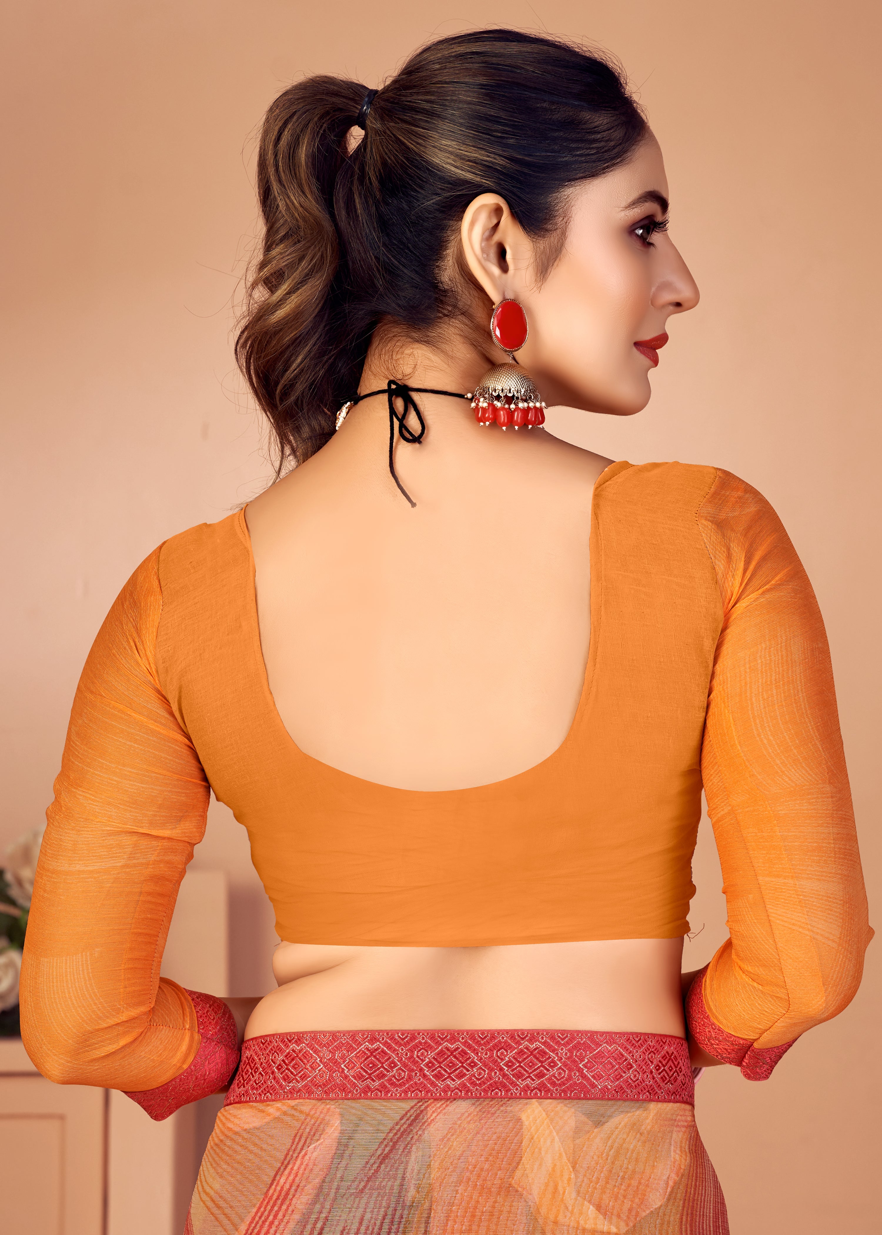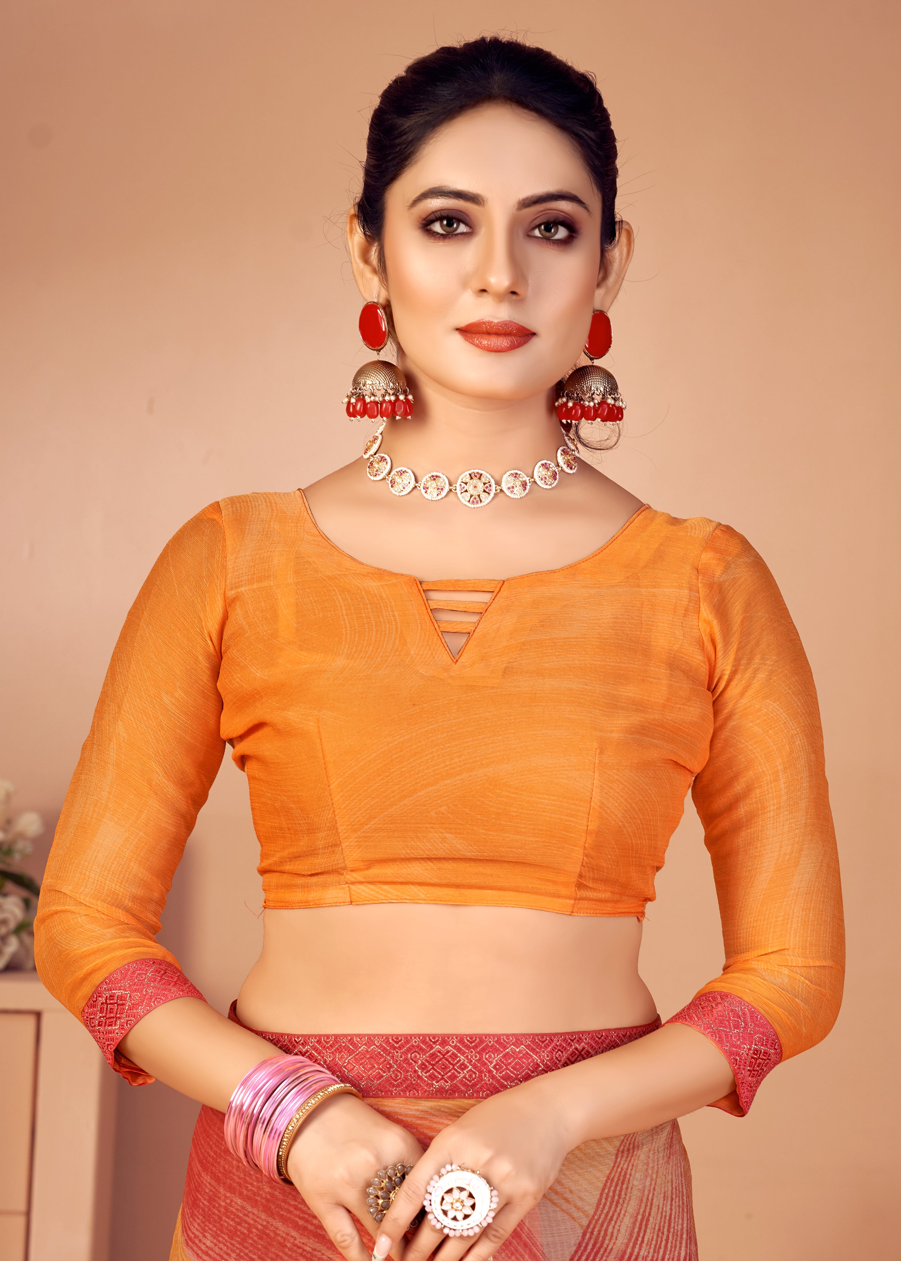 Fancy Multicolored printed, Chiffon saree with attached banarasi border (Orange)