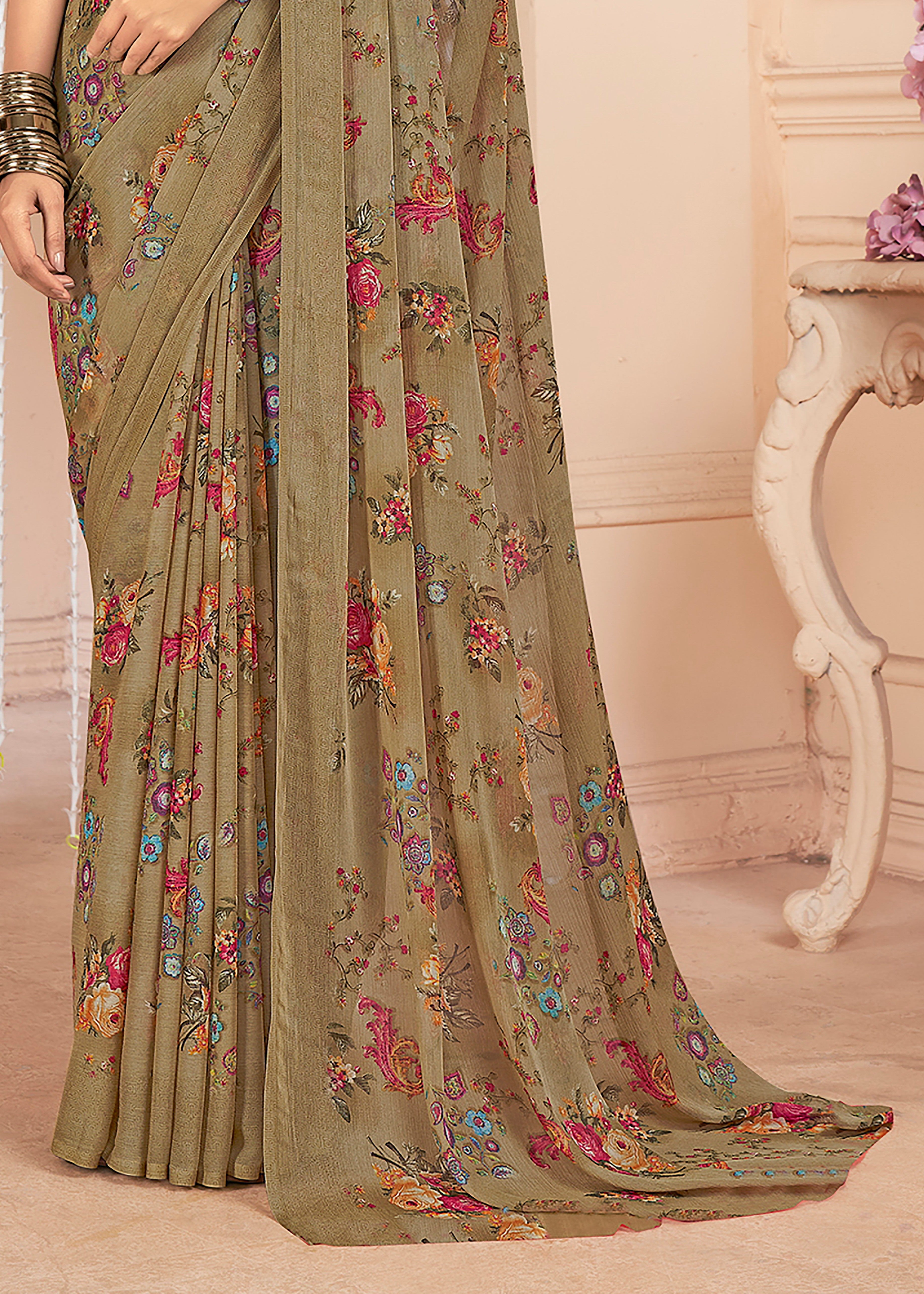 Floral Print, Graphic Print Kalamkari Chiffon, Georgette Saree (Brown Khakhi)
