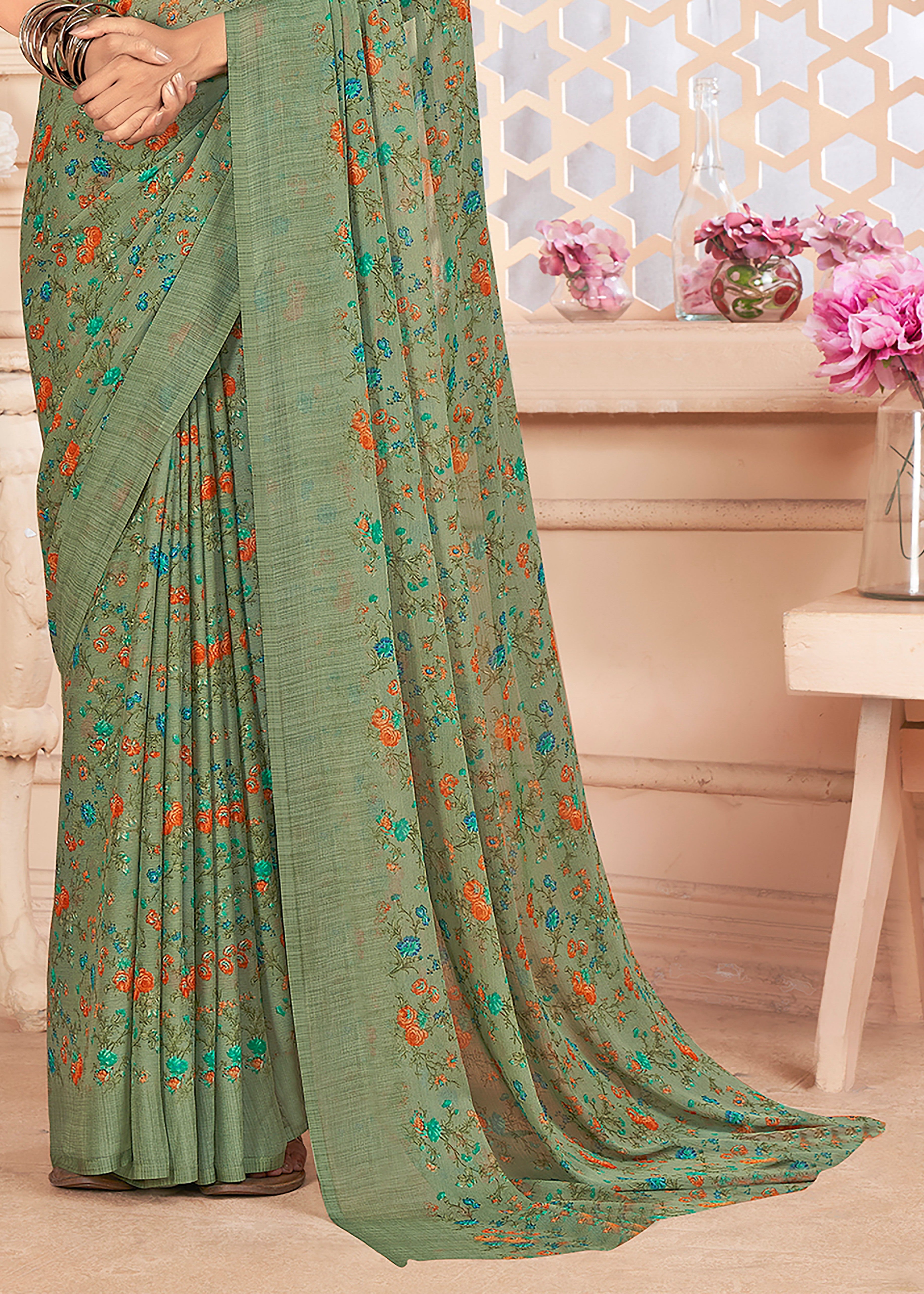 Printed Bollywood Chiffon, Georgette Saree (Olive Green)