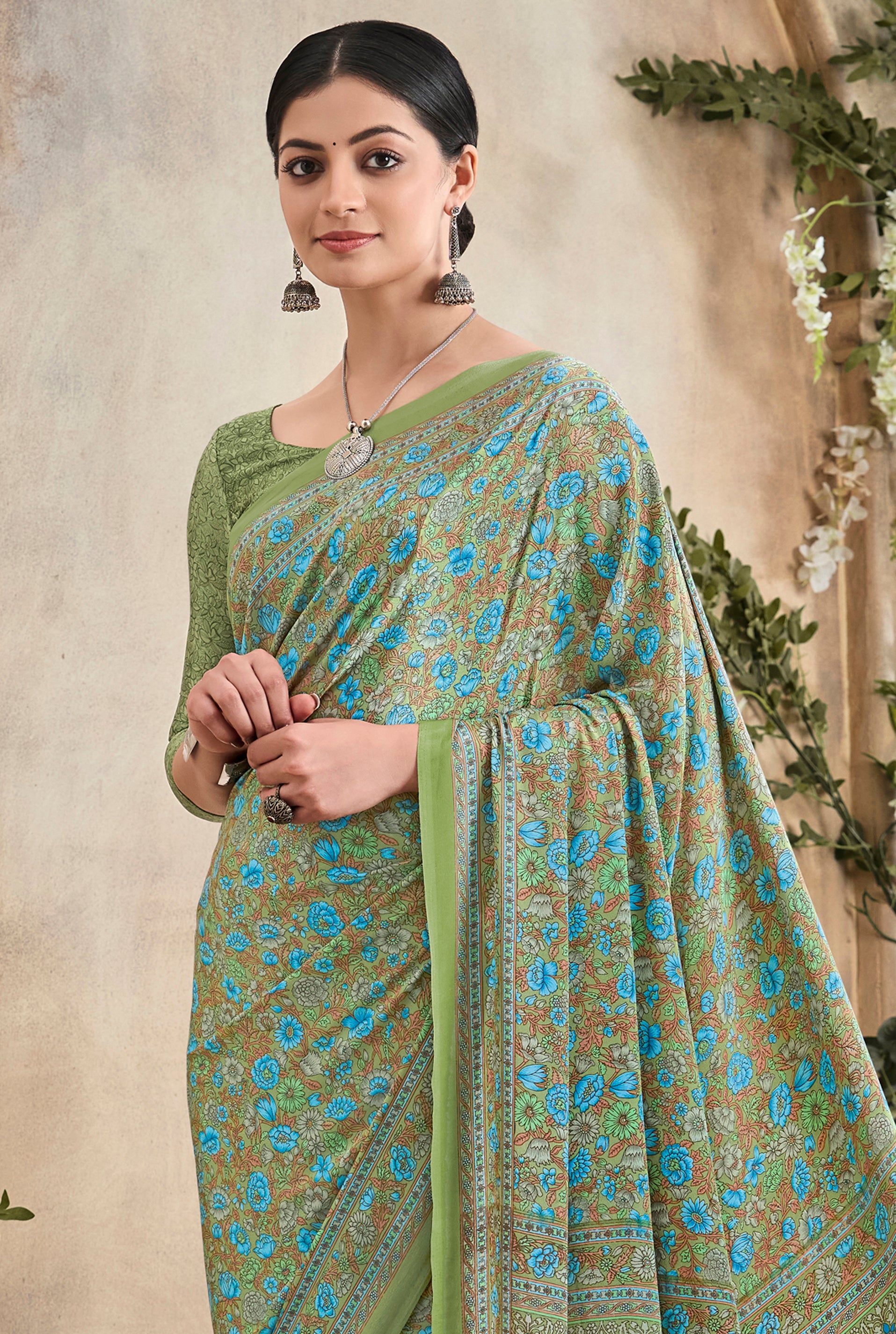 Flower Multi-Coloured Printed, Pure Italian Crape Sare (Green)