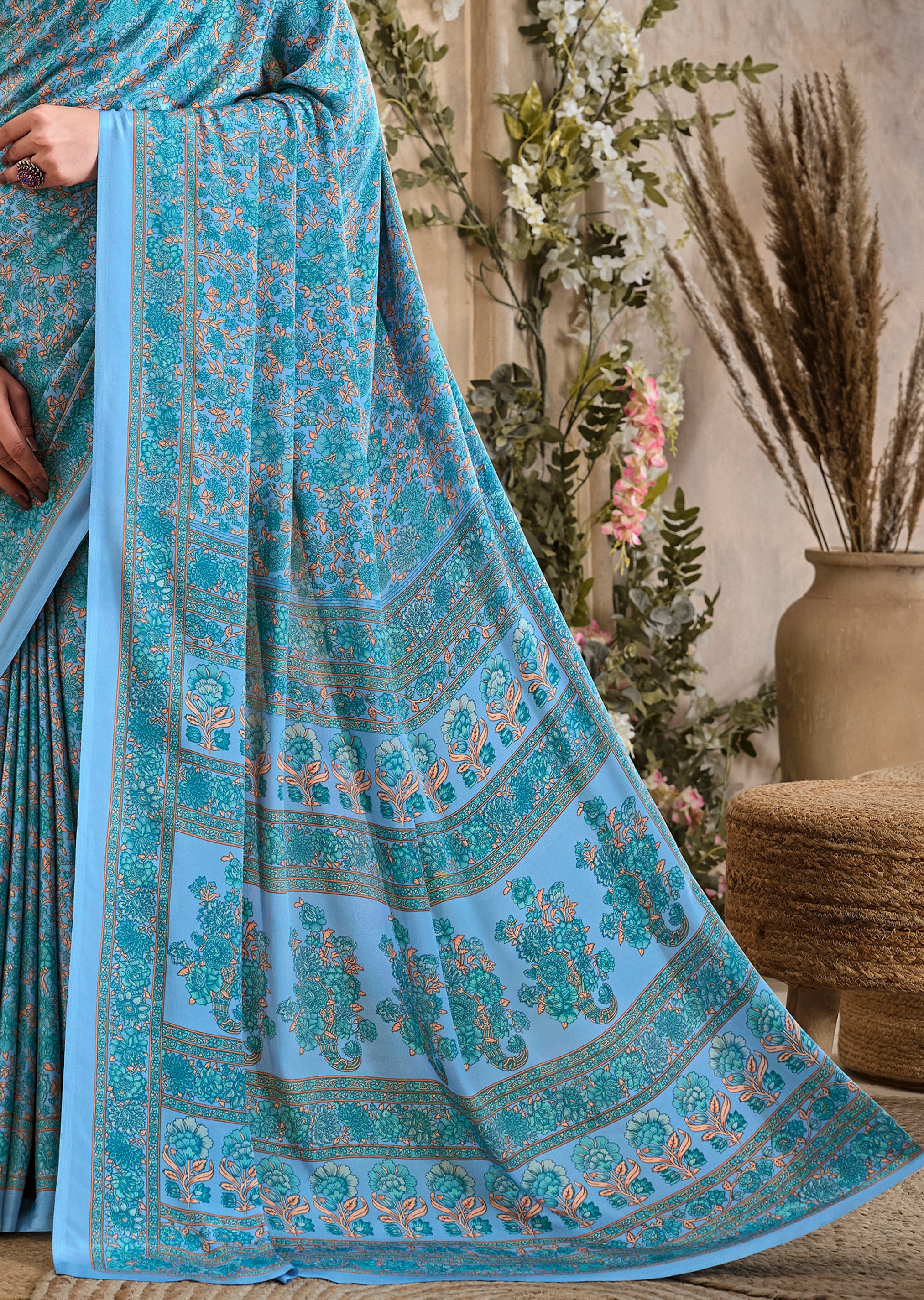 Flower Multi-Coloured Printed, Pure Italian Crape Saree (Blue)