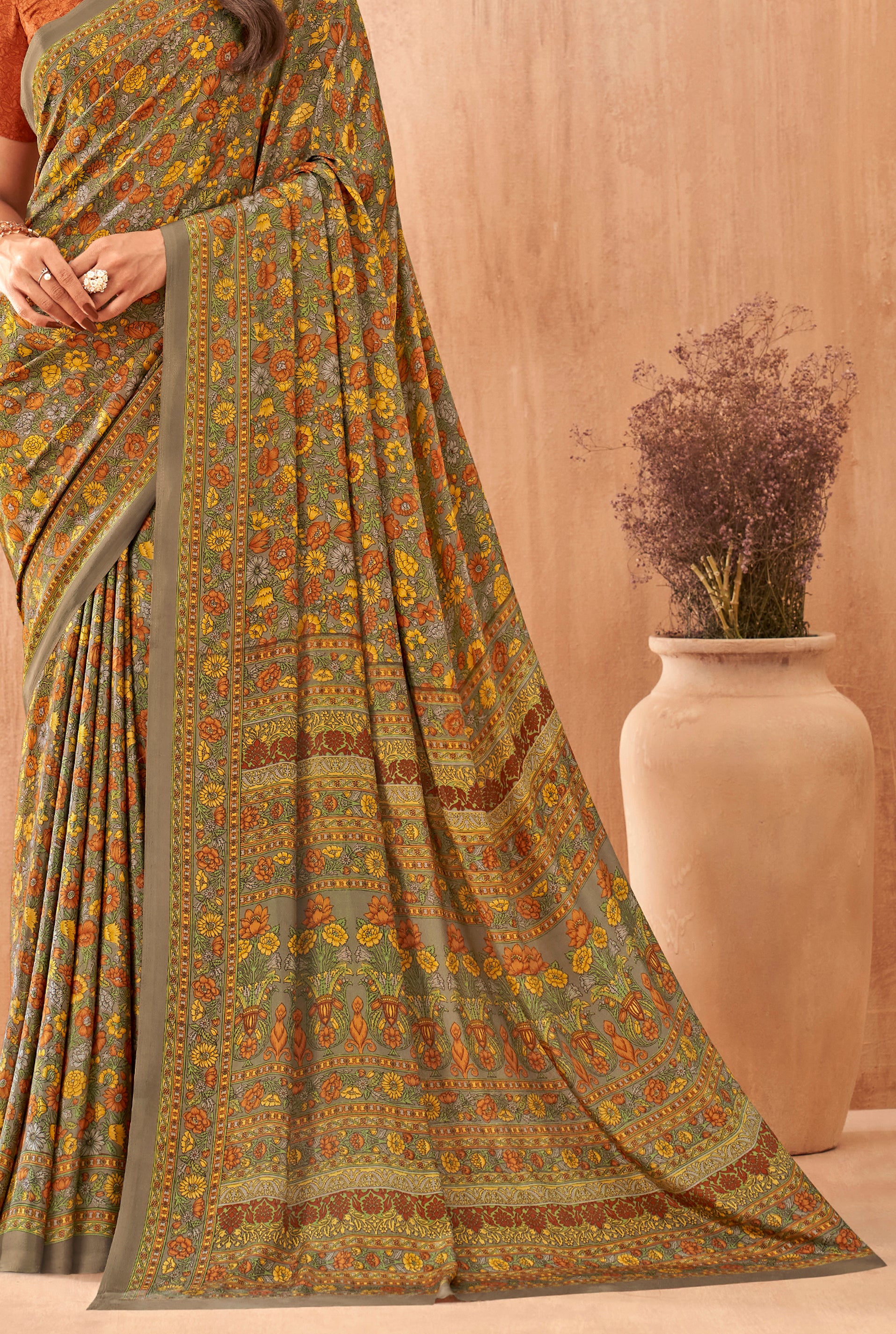 Flower Multi-Coloured Printed, Pure Italian Crape Saree (Brown)