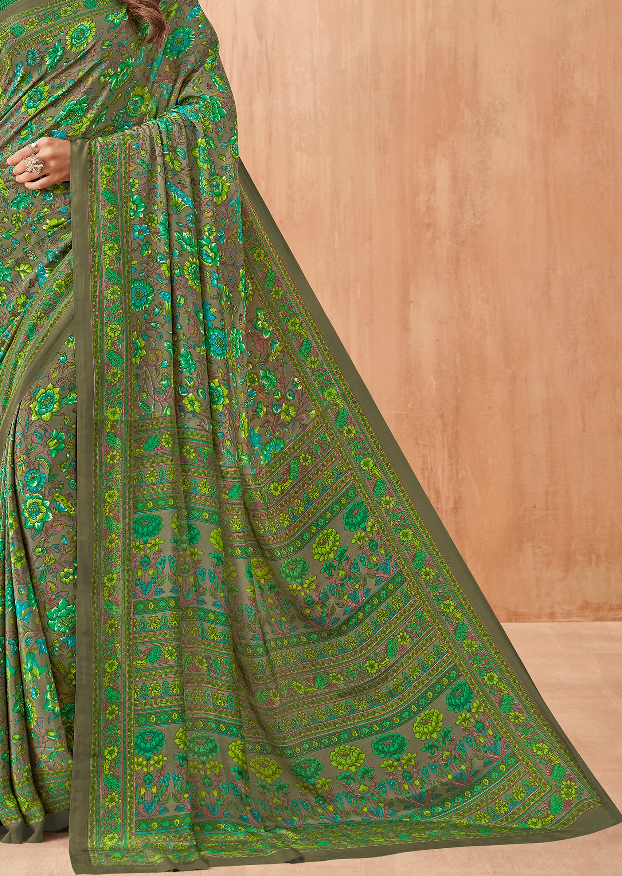 Flower Multi-Coloured Printed, Pure Italian Crape Saree (Green)