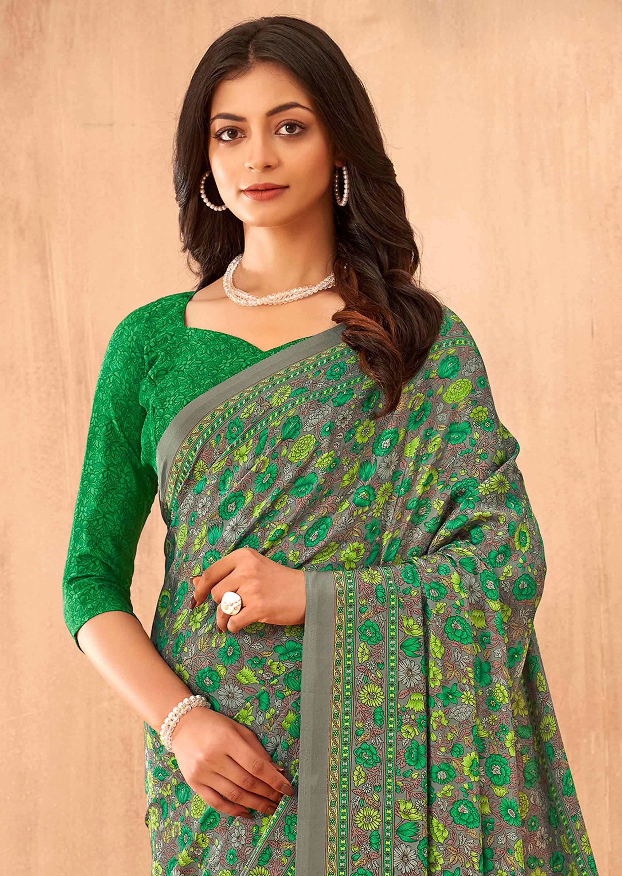 Flower Multi-Coloured Printed, Pure Italian Crape Saree (Green)