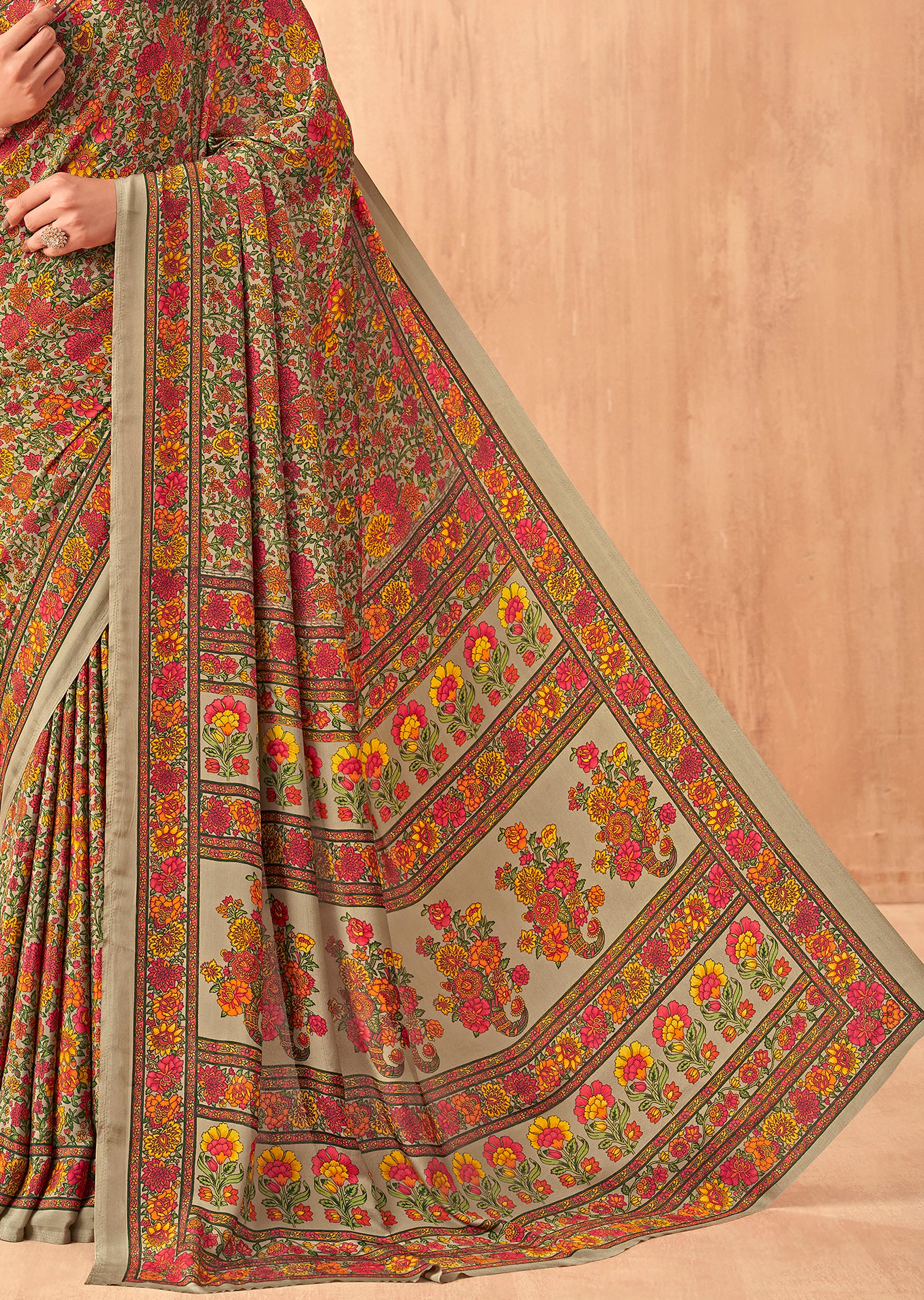 Flower Multi-Coloured Printed, Pure Italian Crape Saree (orange)