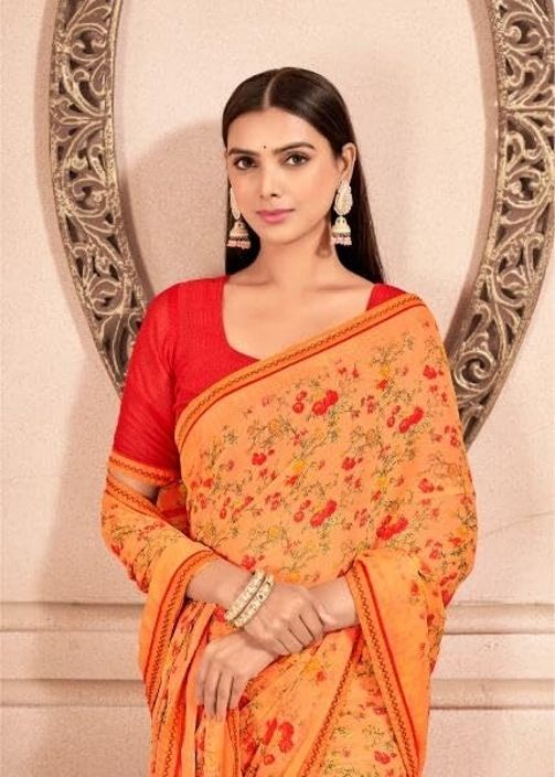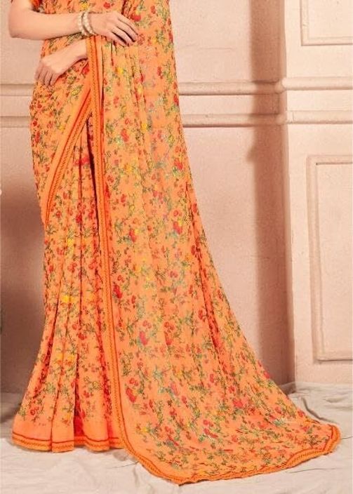 Fancy pure star chiffon saree with floral design and running pallu with attached fancy embroidered border. It has a solid colored or self printed blouse piece with border included with the saree. This is the best chiffon saree out there which has very smooth and soft fabric with embroidered Lace Border.