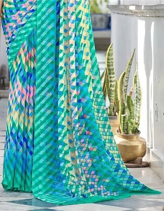 Geometric Print, Graphic Print Bollywood Chiffon, Georgette Saree (Dark Green)