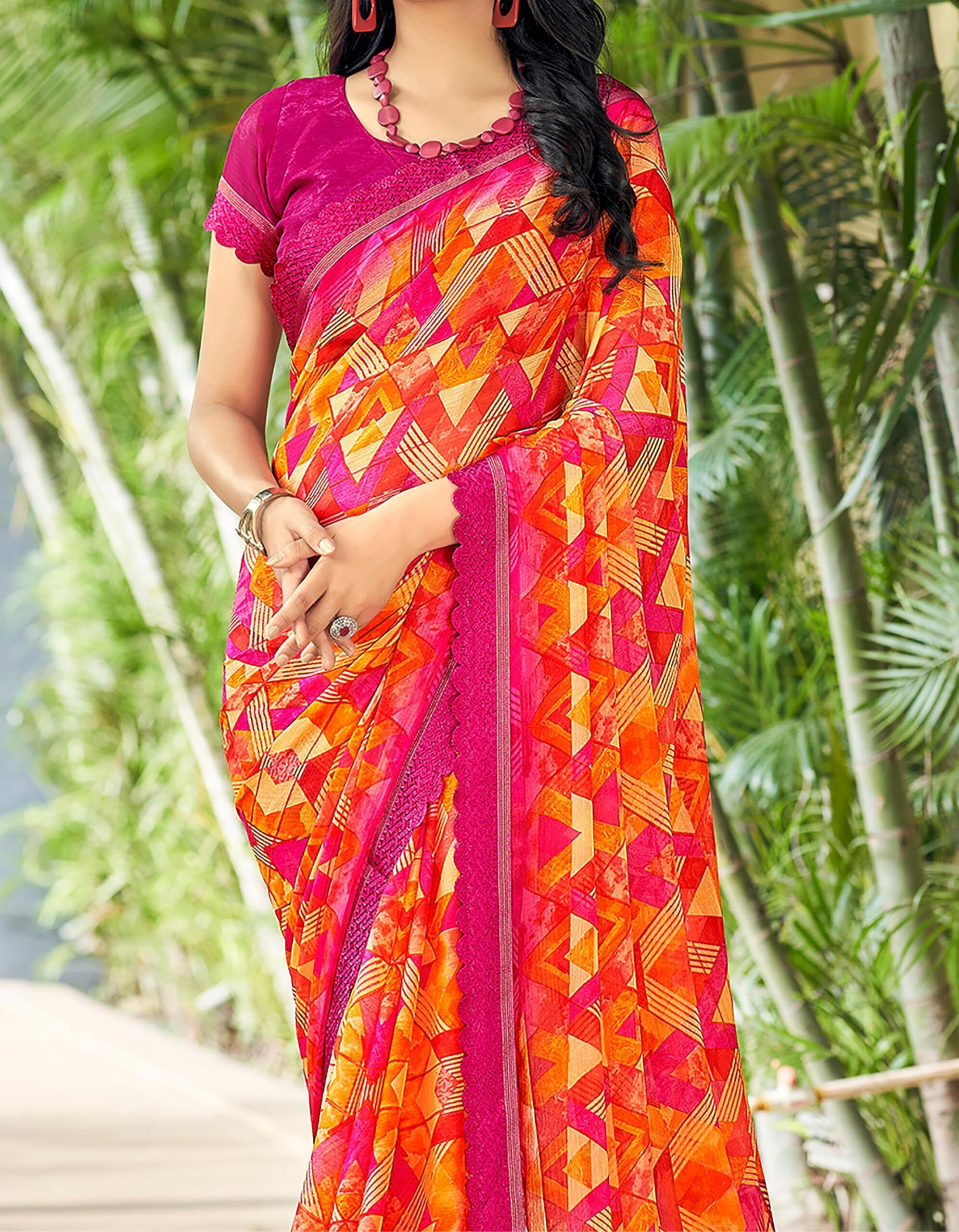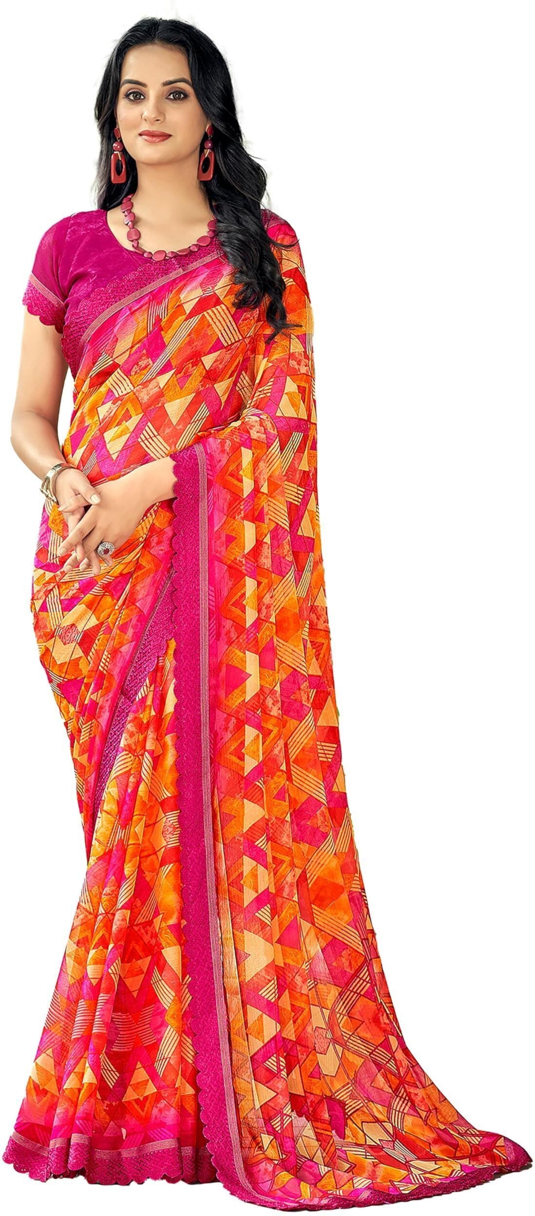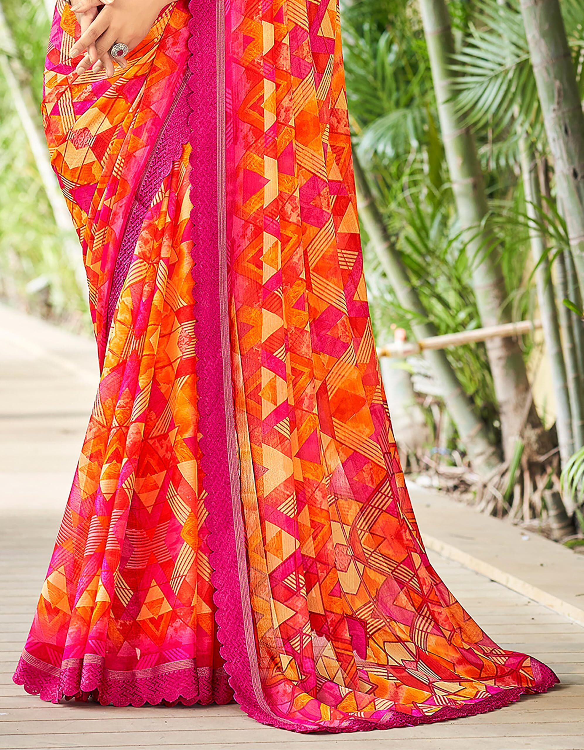 Geometric Print, Graphic Print Bollywood Chiffon, Lace Saree (Pink)