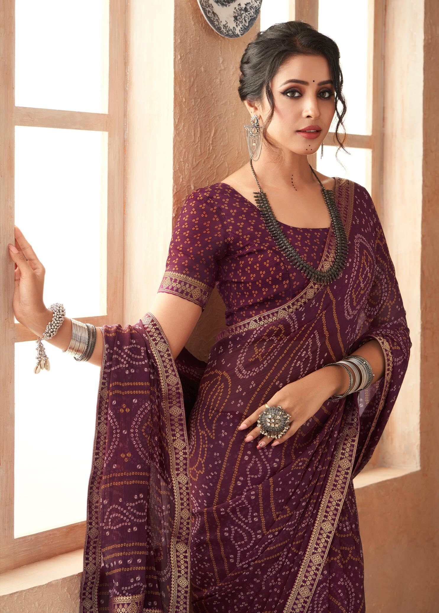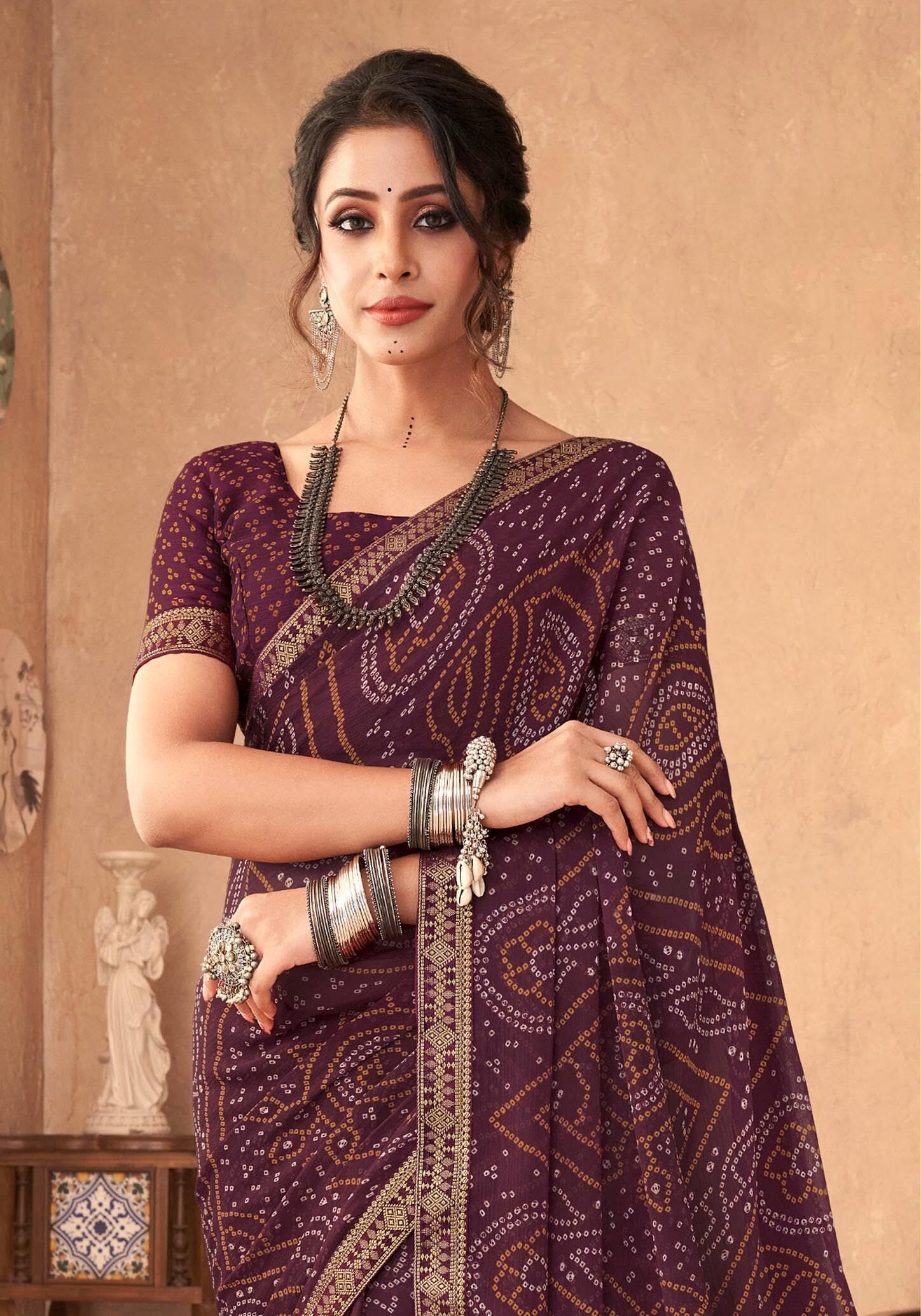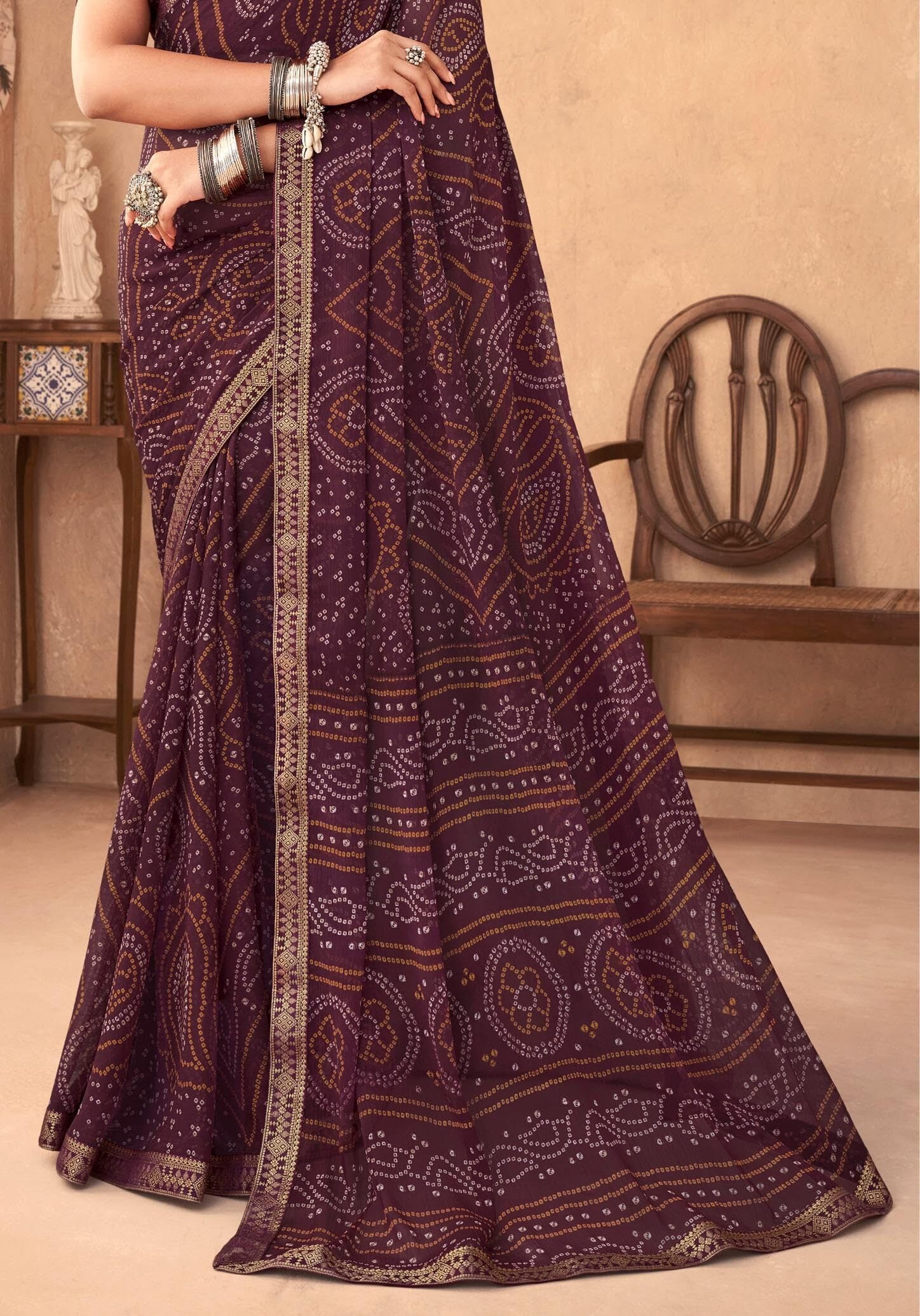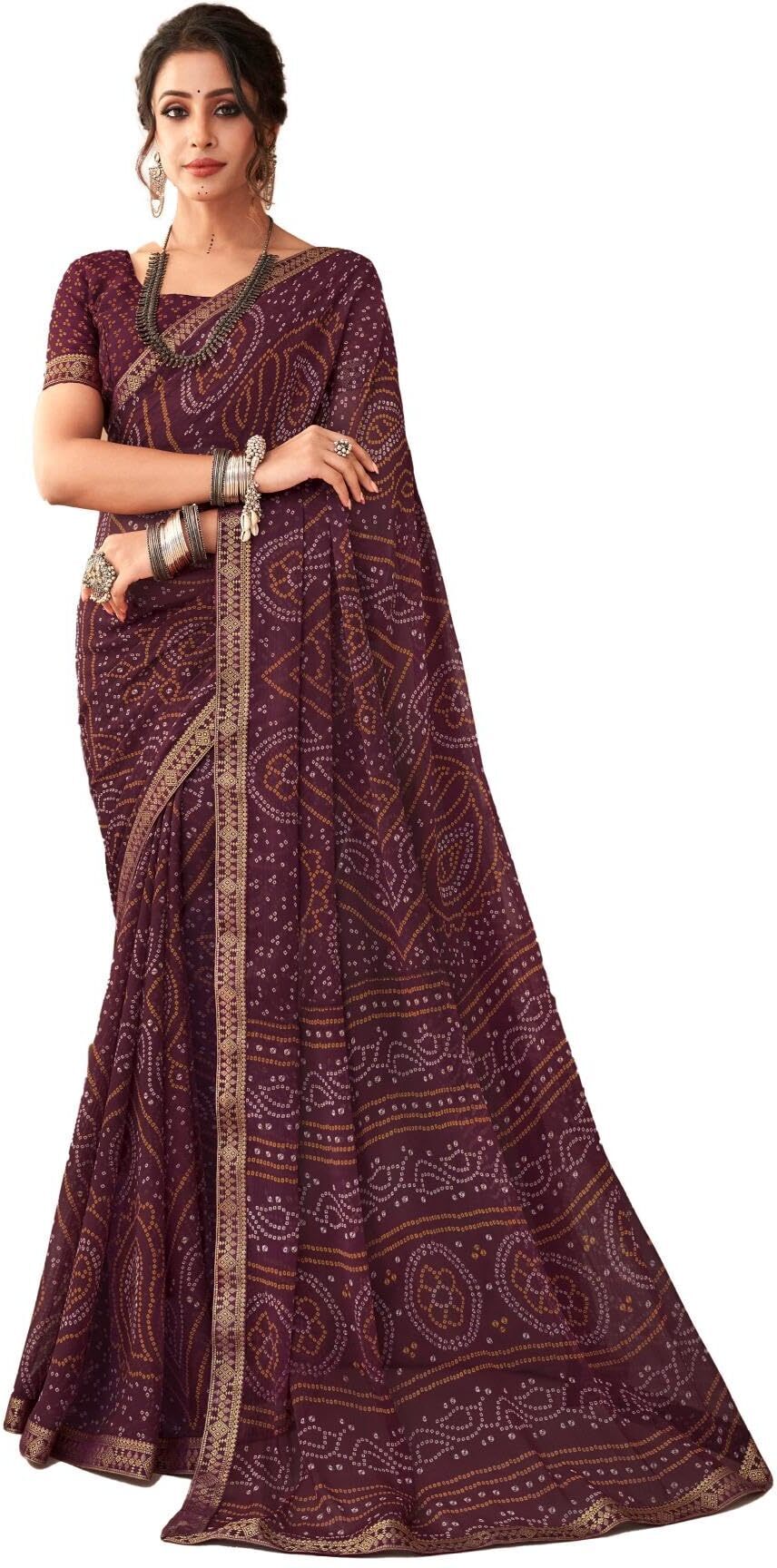 Graphic Print, Printed Bandhani Chiffon, Georgette Saree (Maroon)