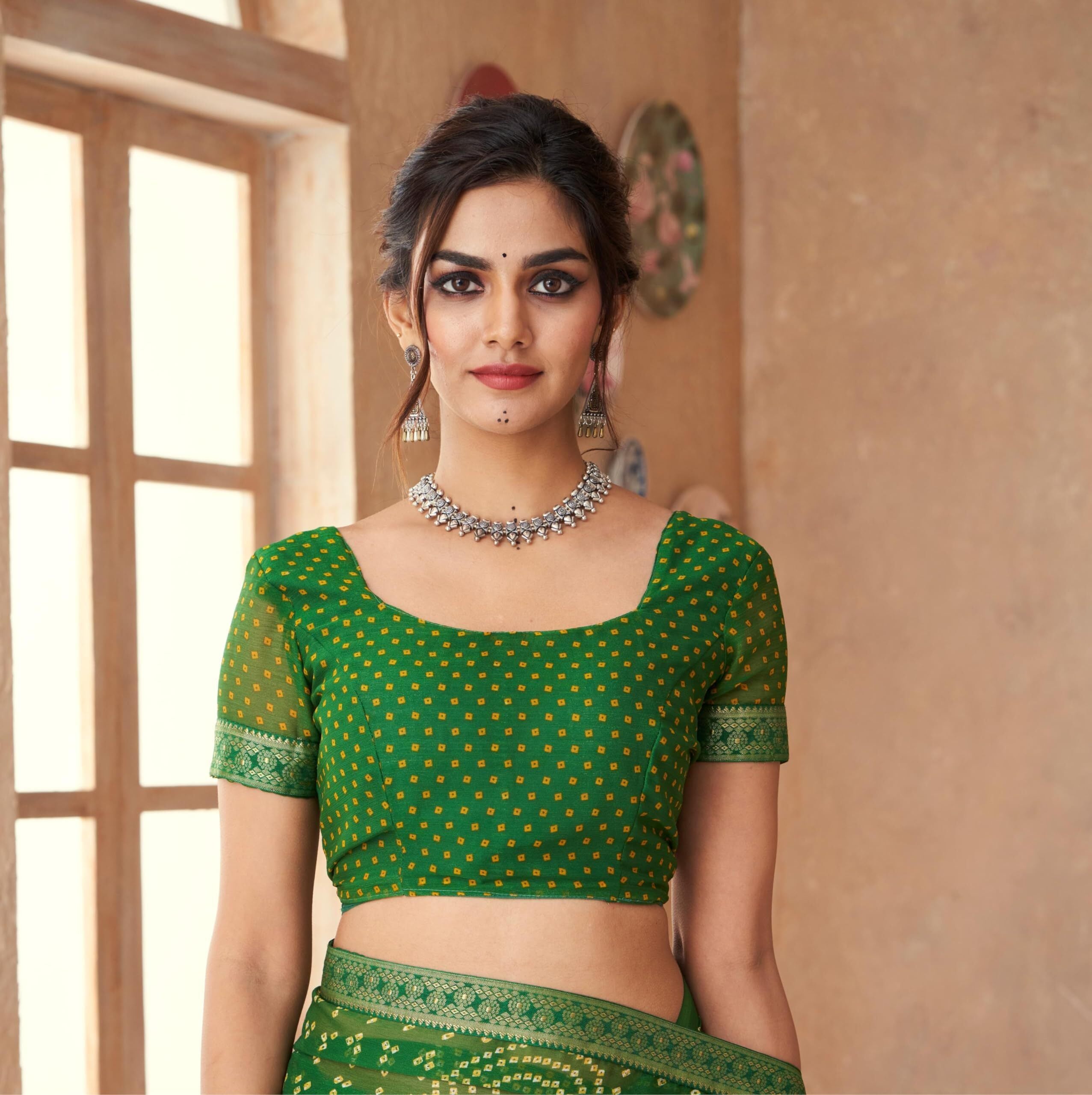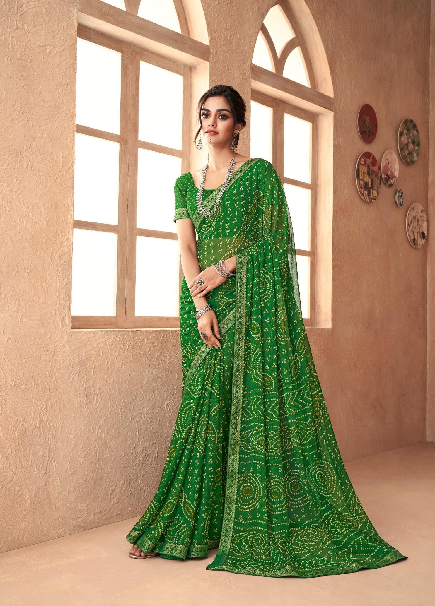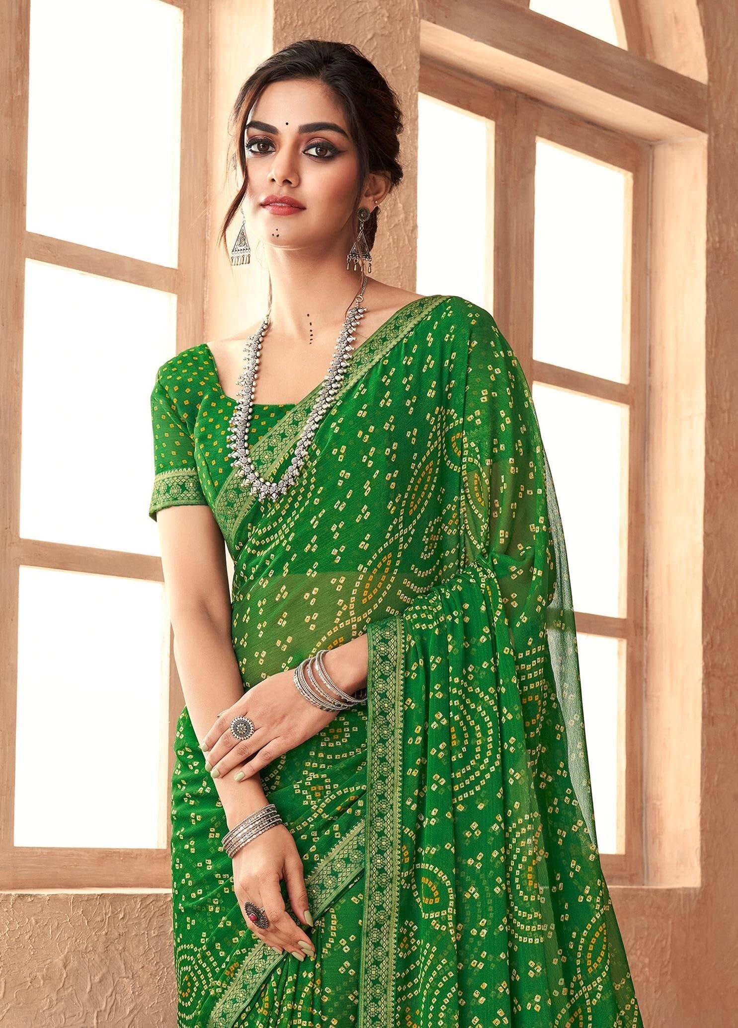 Graphic Print, Printed Bandhani Chiffon, Georgette Saree (Green)