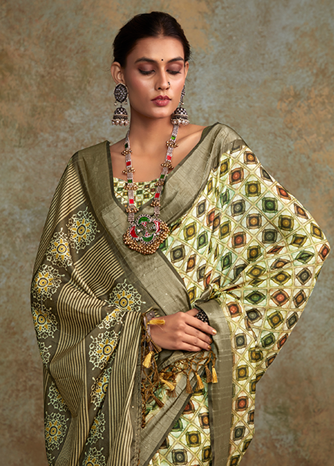 Handloom with All Over Print, Sequence Weaving Saree (Cream)