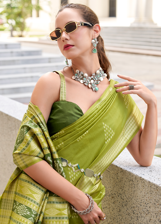 Ikkat Weaving, Reyon silk Contrast pallu Saree (Green)