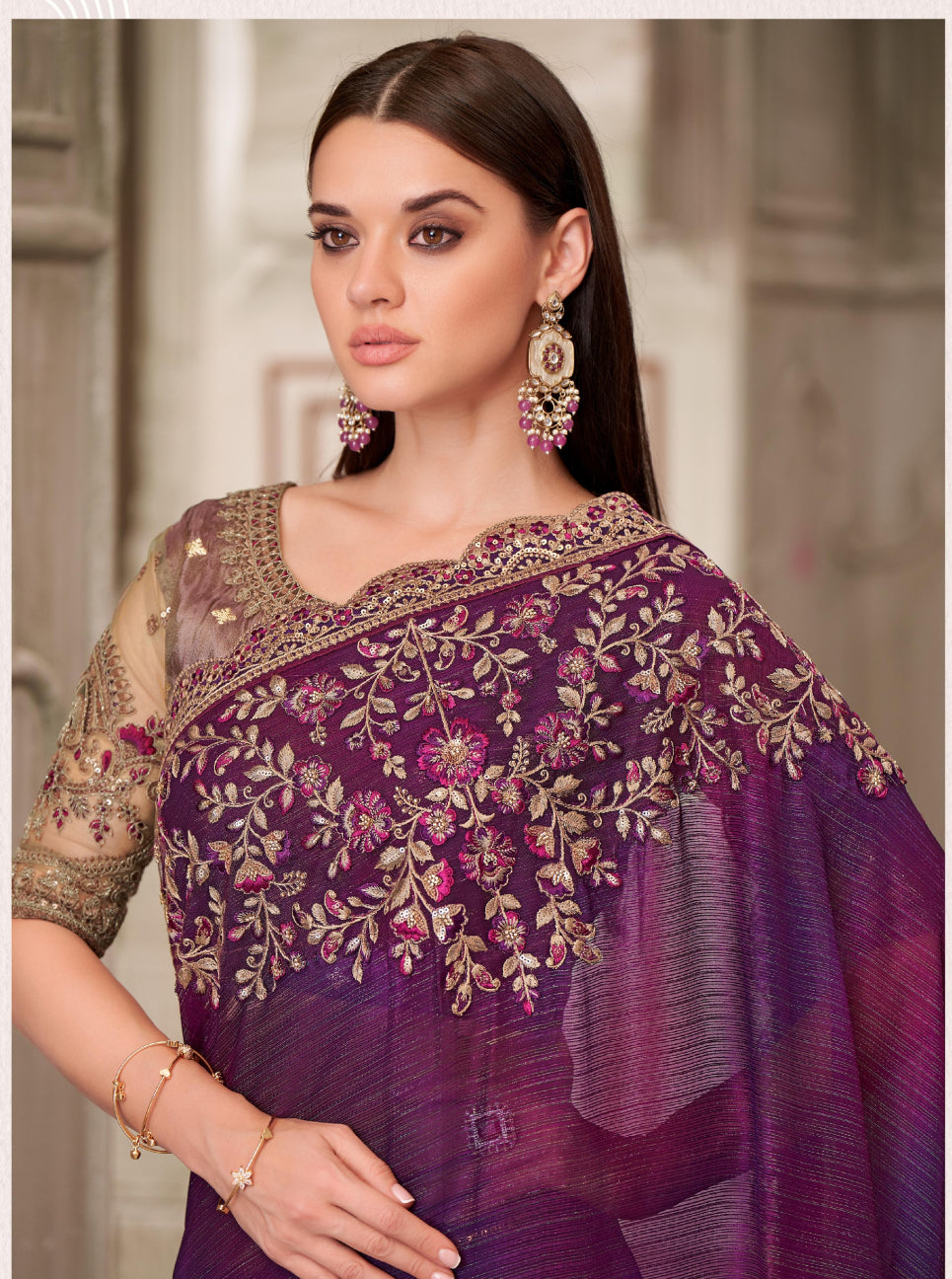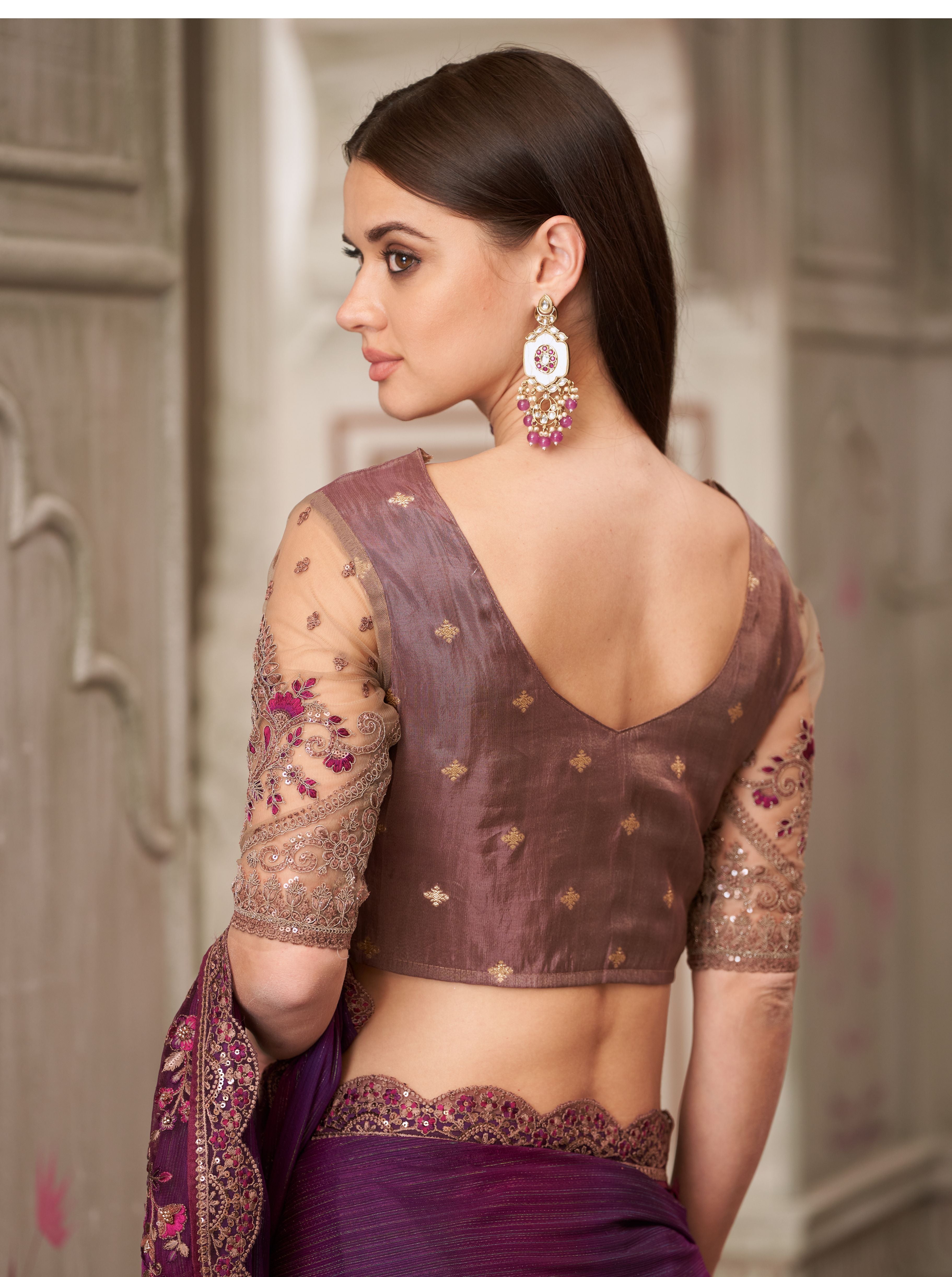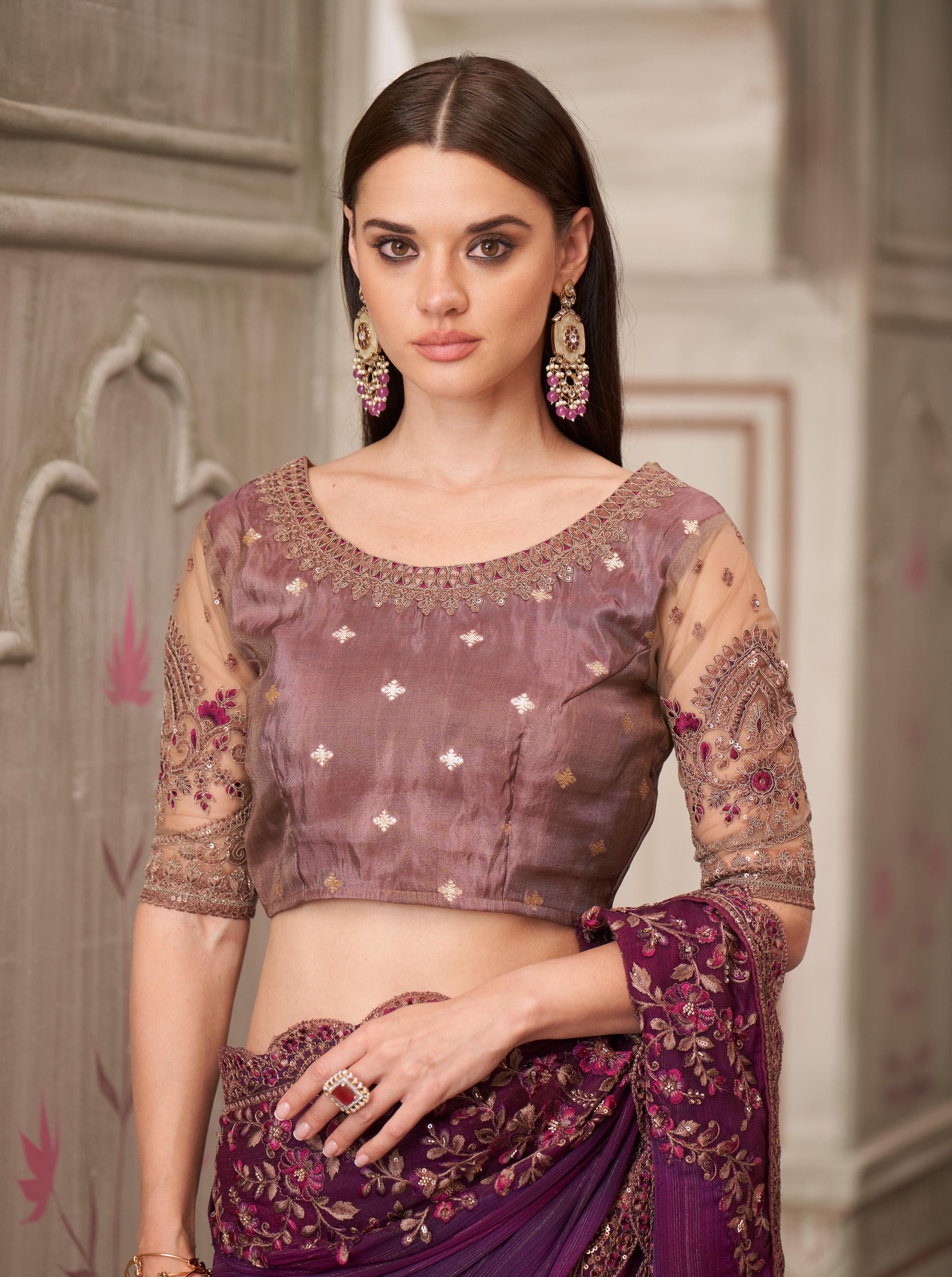 Stunning mulberry shimmer satin georgette saree paired with a luxurious pure silk blouse. Lightweight, elegant, and perfect for festive occasions or special events, combining comfort with sophistication.