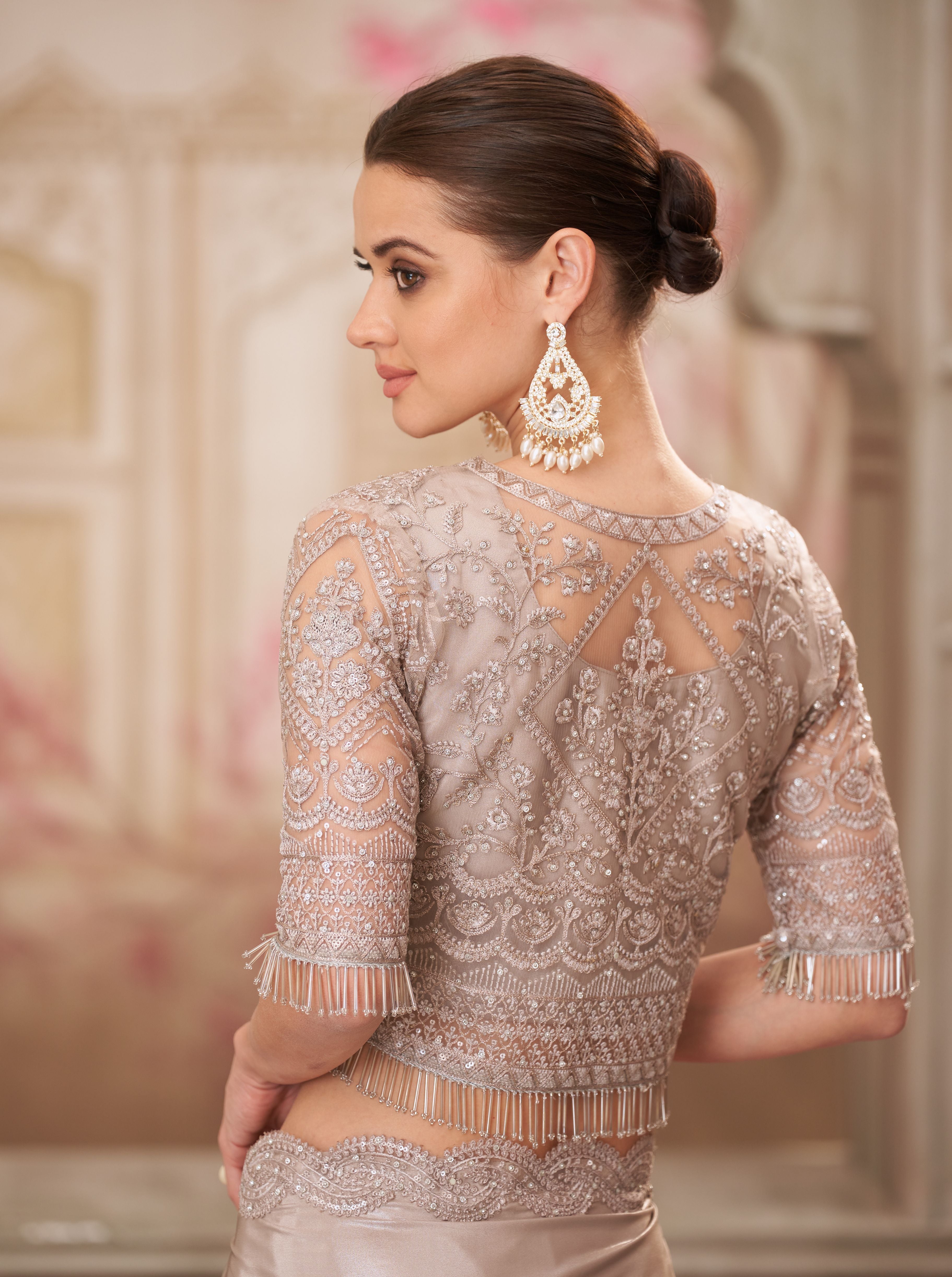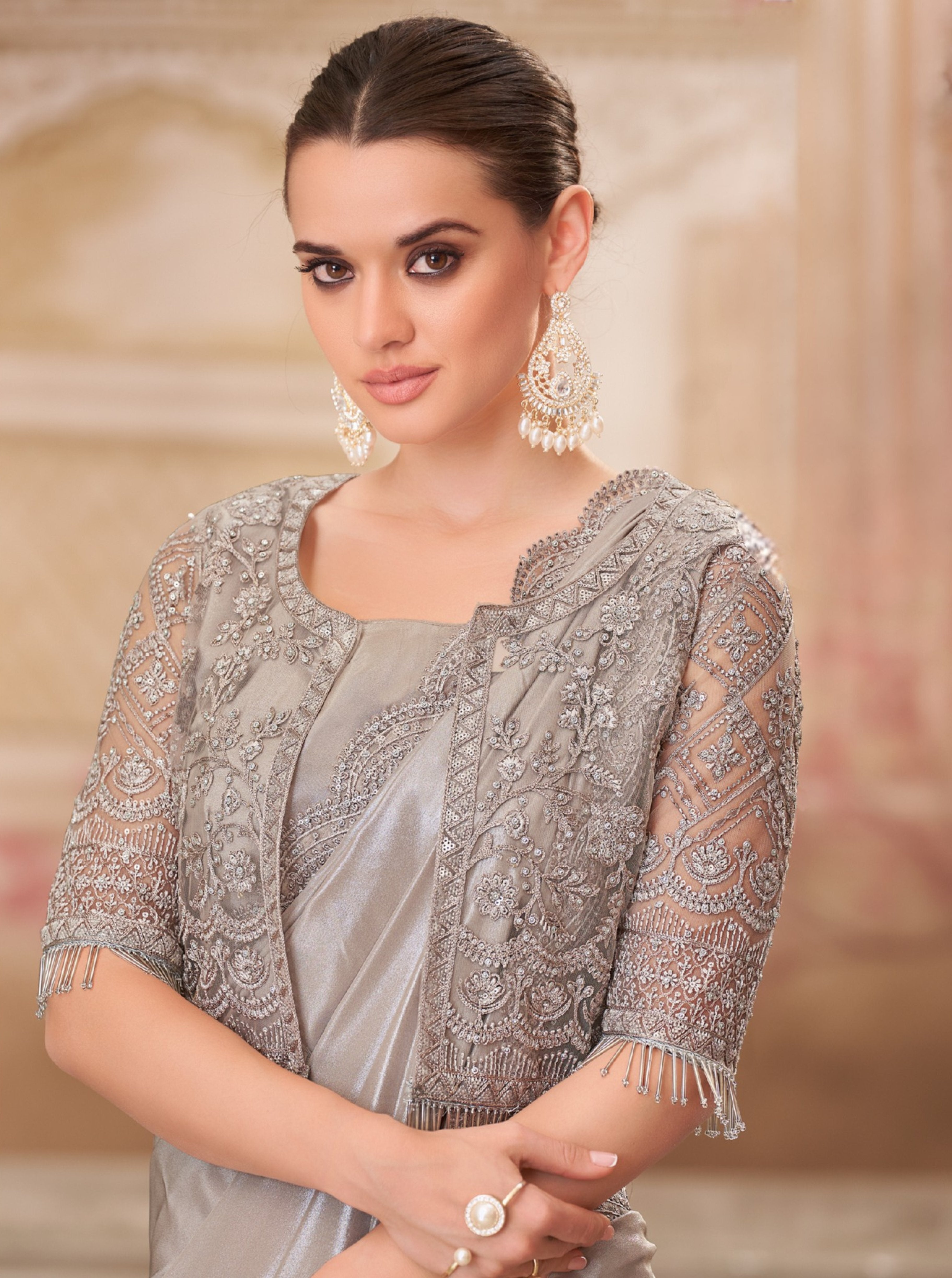 Graceful pearl grey shimmer satin silk saree paired with a stylish jacket-style net blouse. Elegant and lightweight, perfect for festive occasions and parties, offering a contemporary twist to traditional wear.