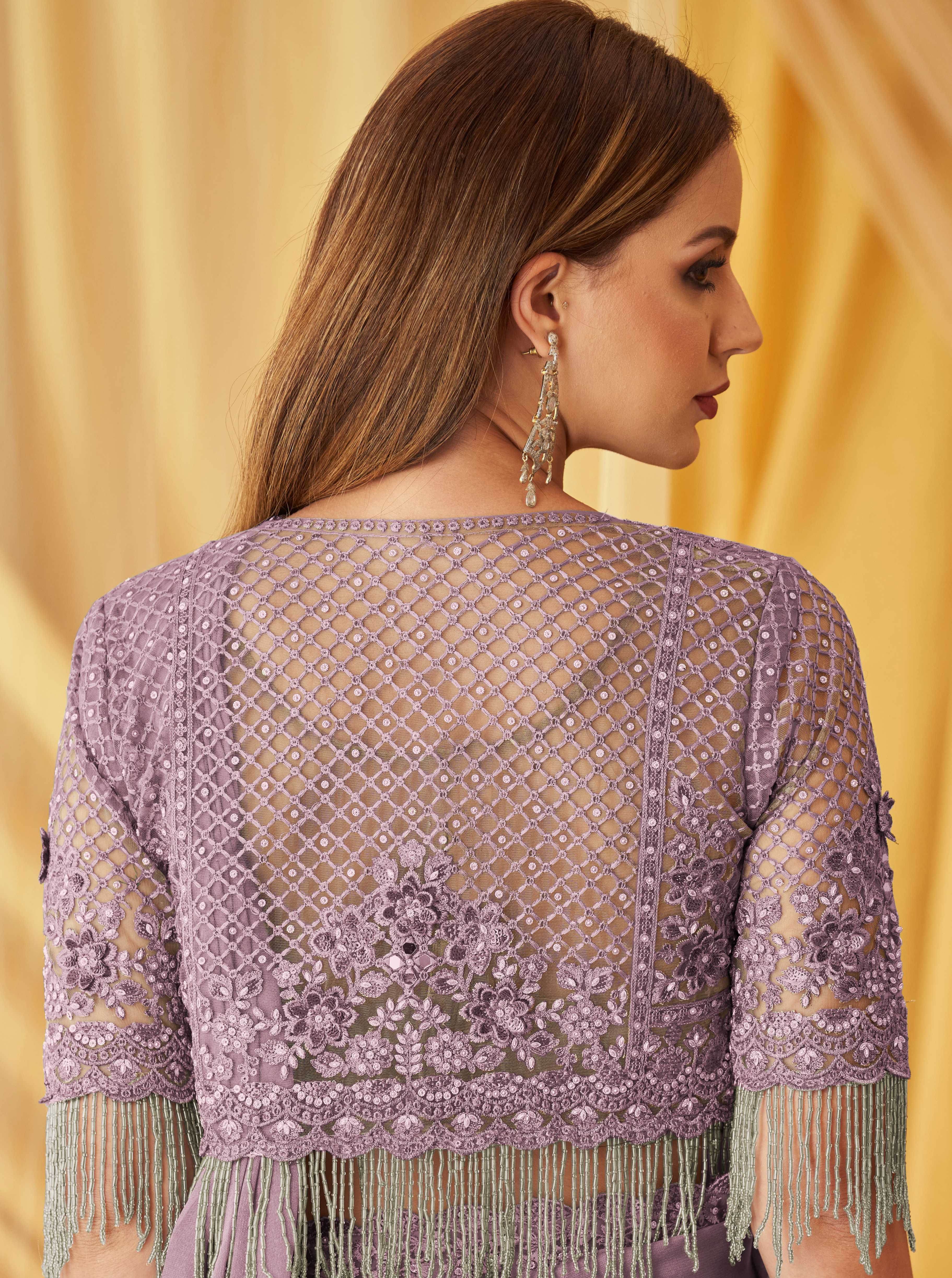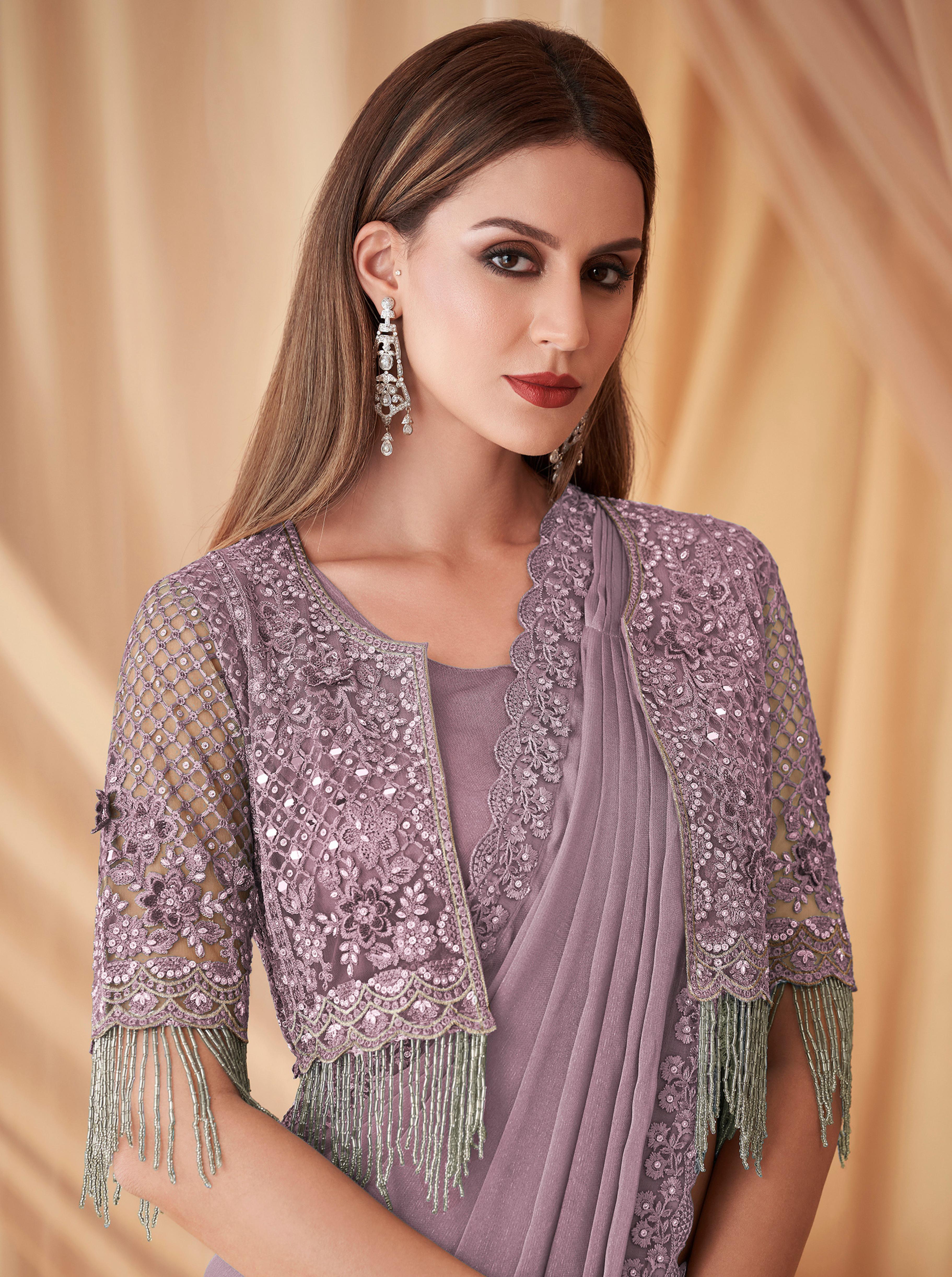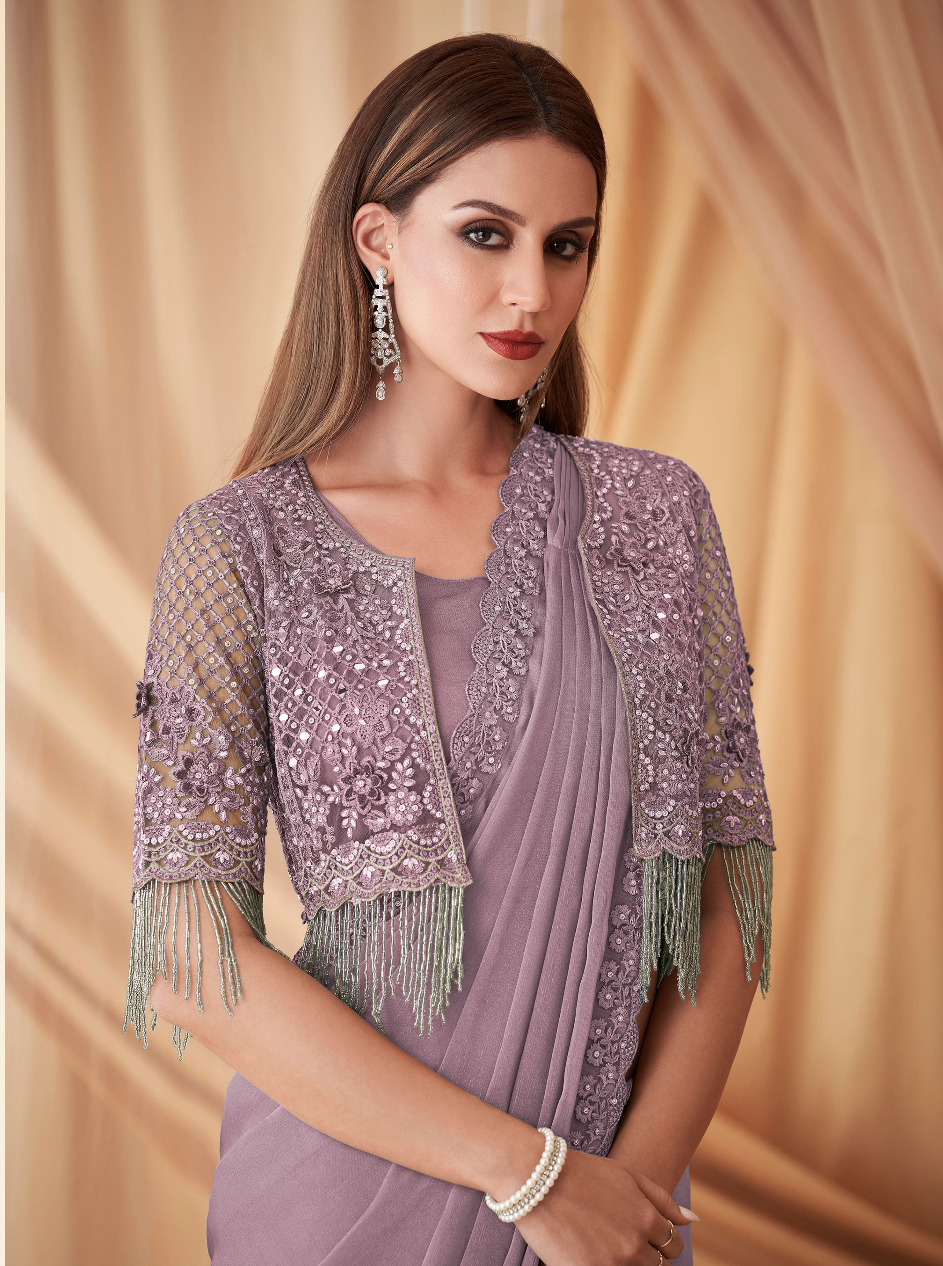 Elevate your festive look with this sparkling satin georgette saree paired with an unstitched work blouse. The ensemble is completed with a stylish attached jacket featuring delicate glass latkan detailing, adding a touch of glamour and elegance — perfect for weddings and special occasions.