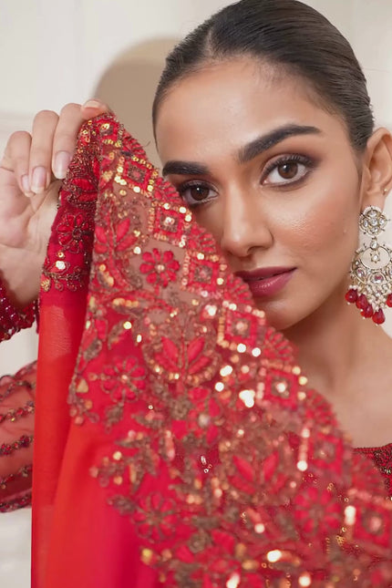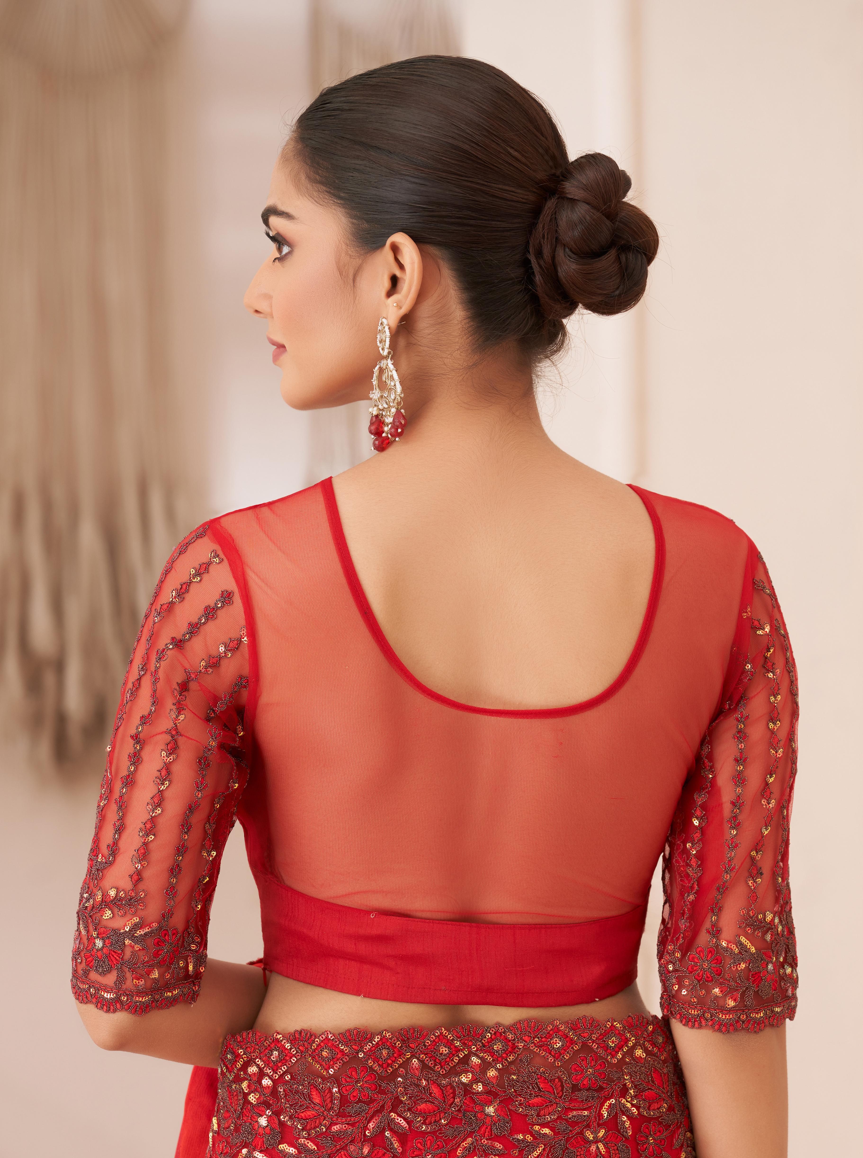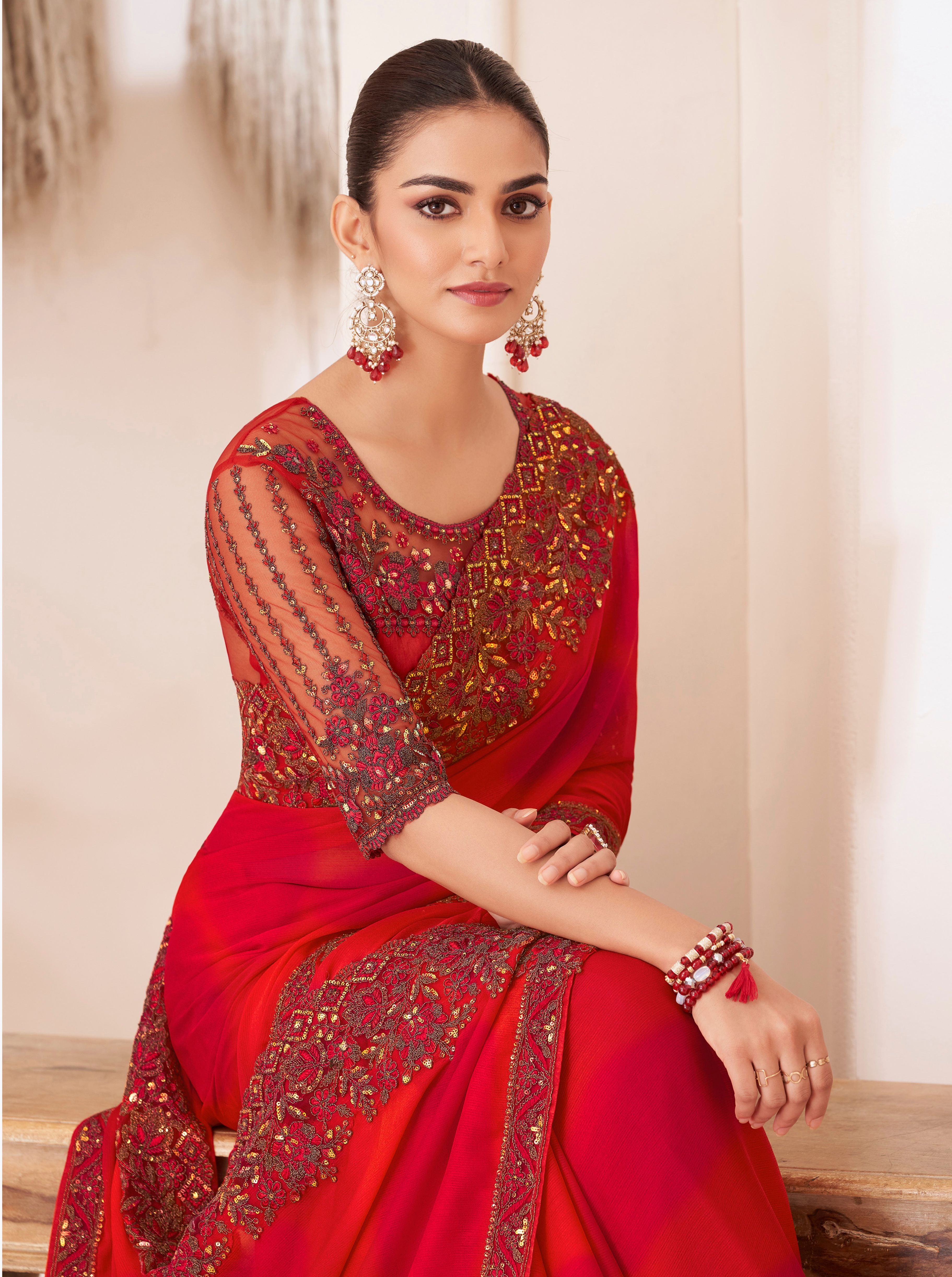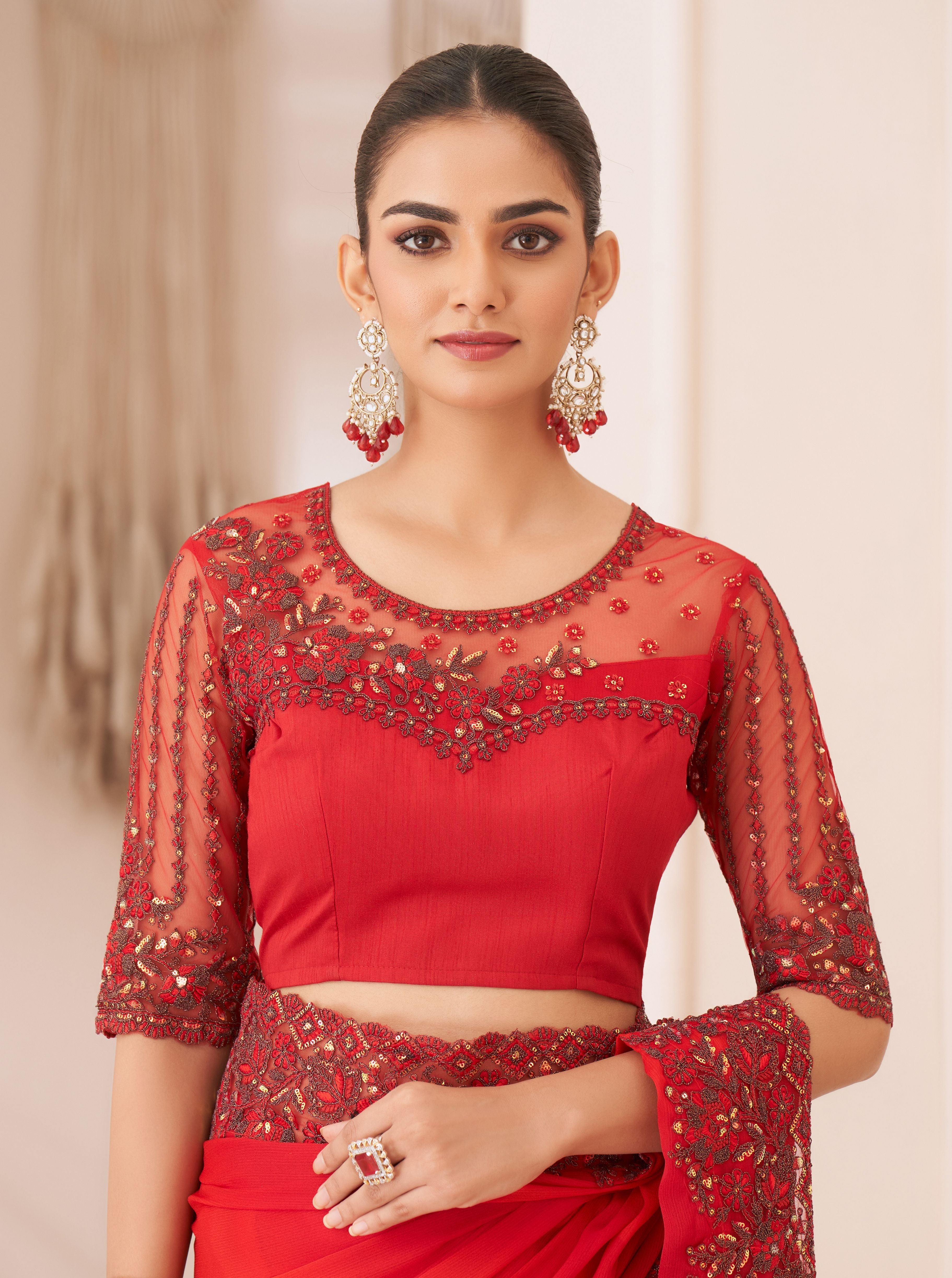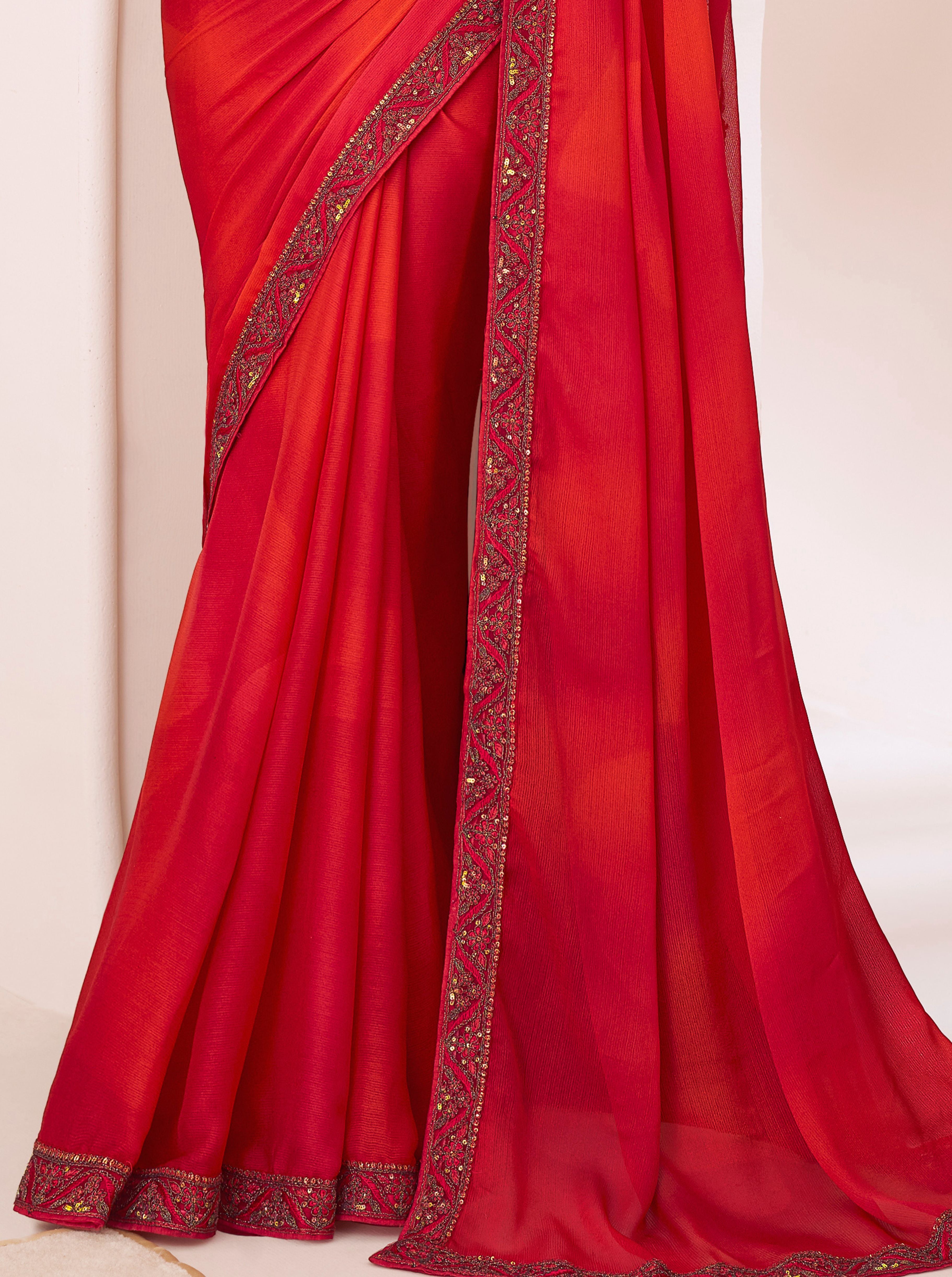 Red Solid Poly Chiffon Saree with Poly Silk Blouse