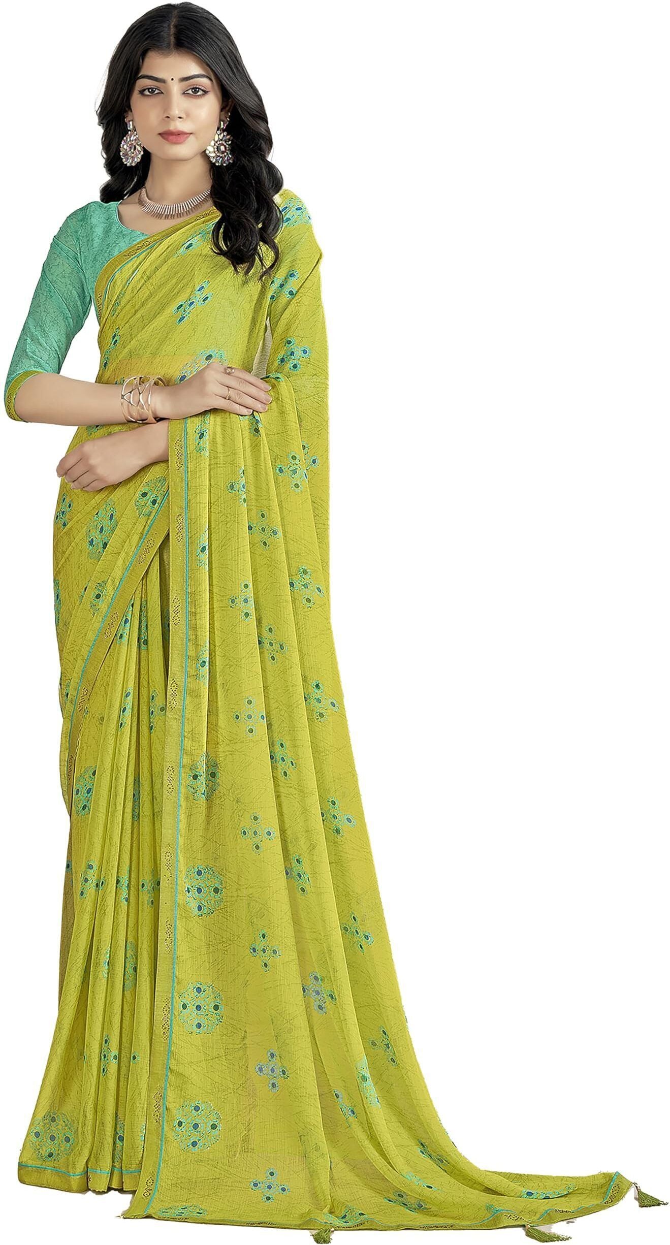 Fancy pure chiffon saree with Botanical Print and running pallu with attached Siroski Lace border. It has a solid colored or self printed blouse piece with border included with the saree. This is the best chiffon saree out there which has very smooth and soft fabric with embroidered Lace Border for elegant look.